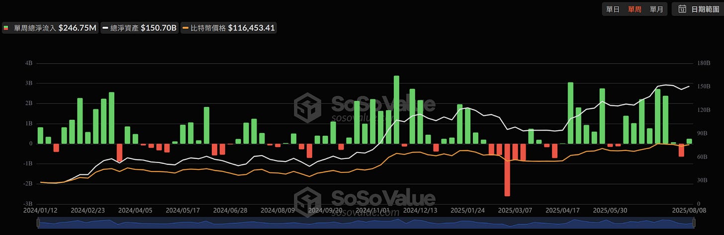 📌BTC 本周流入 2.4 億美元,自上周資金熄火後,本周出現明顯反轉,機構重新進場買入,推升 $BTC 回到 117,000 水平。8/8 更錄得 3.5 億美元淨流入,其中 IBIT 貢獻最大。若後續資金流入能延續前幾日的強勁勢頭,疊加宏觀環境與避險需求支撐,不排除 BTC 有機會再度挑戰前高,並吸引更多追價買盤入場。