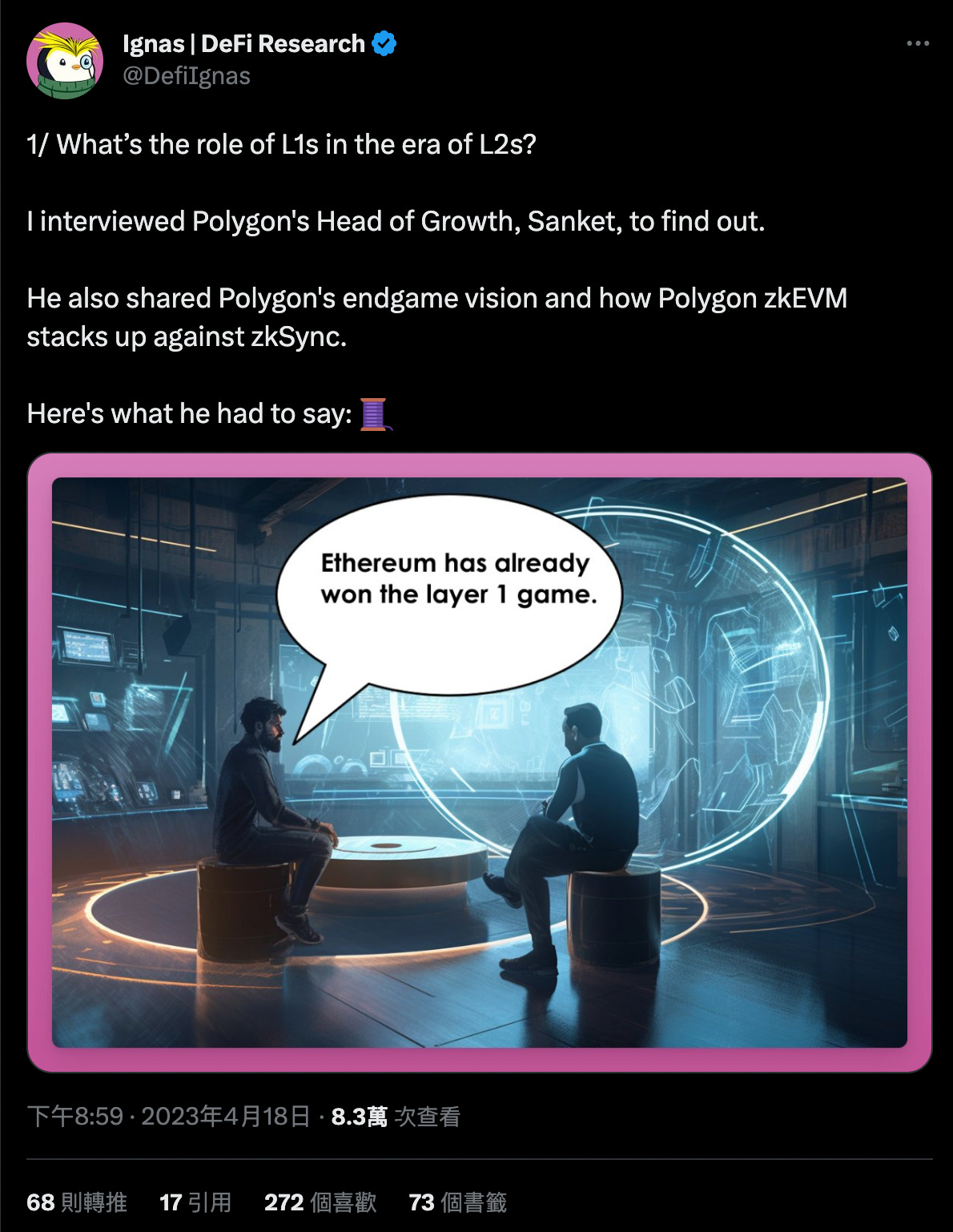 有趣的是,這與 Polygon 的成長主管 sourcex44 認為的相反。你可以在下面的討論串中找到他為什麼認為以太坊已經贏得了公鏈戰爭的原因。