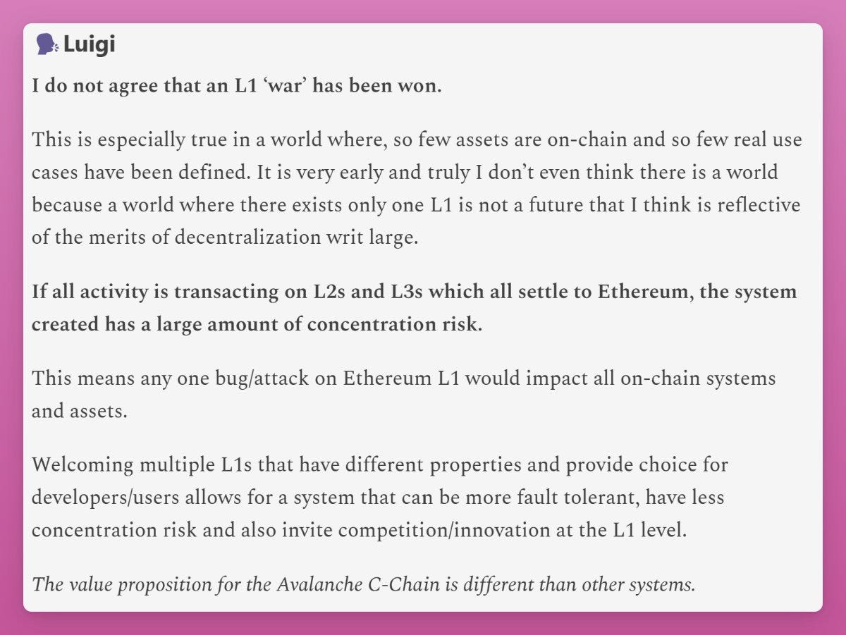 Luigi 不同意以太坊贏得了公鏈「戰爭」。 如果所有活動都集中在以太坊上,會存在集中風險。