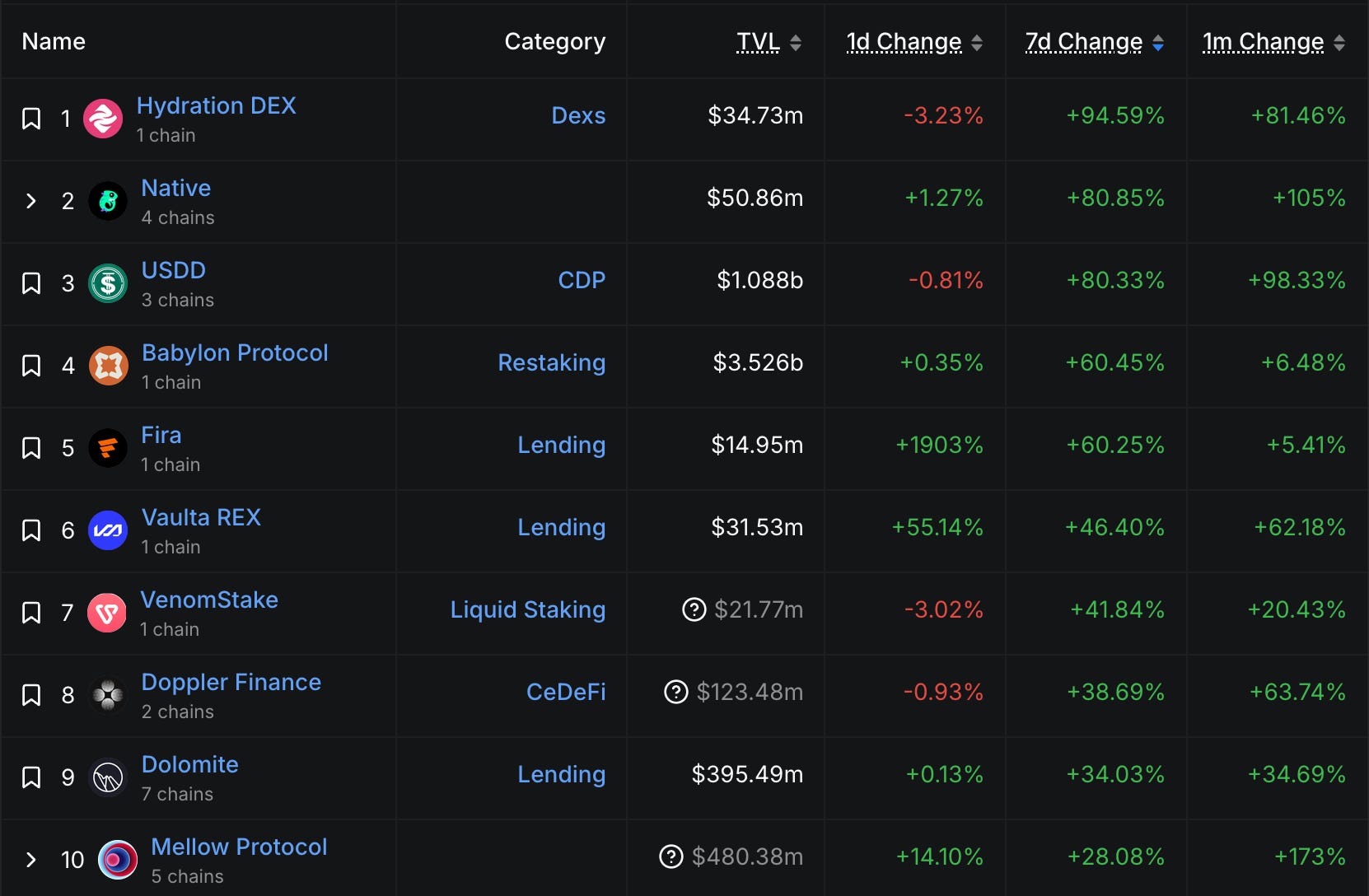 Hydration DEX(3,473 萬美元,94.59%)新 HEURC 穩定池推出 + PRIME 收益循環(額外 3.5% 收益),吸引生態資金流入。