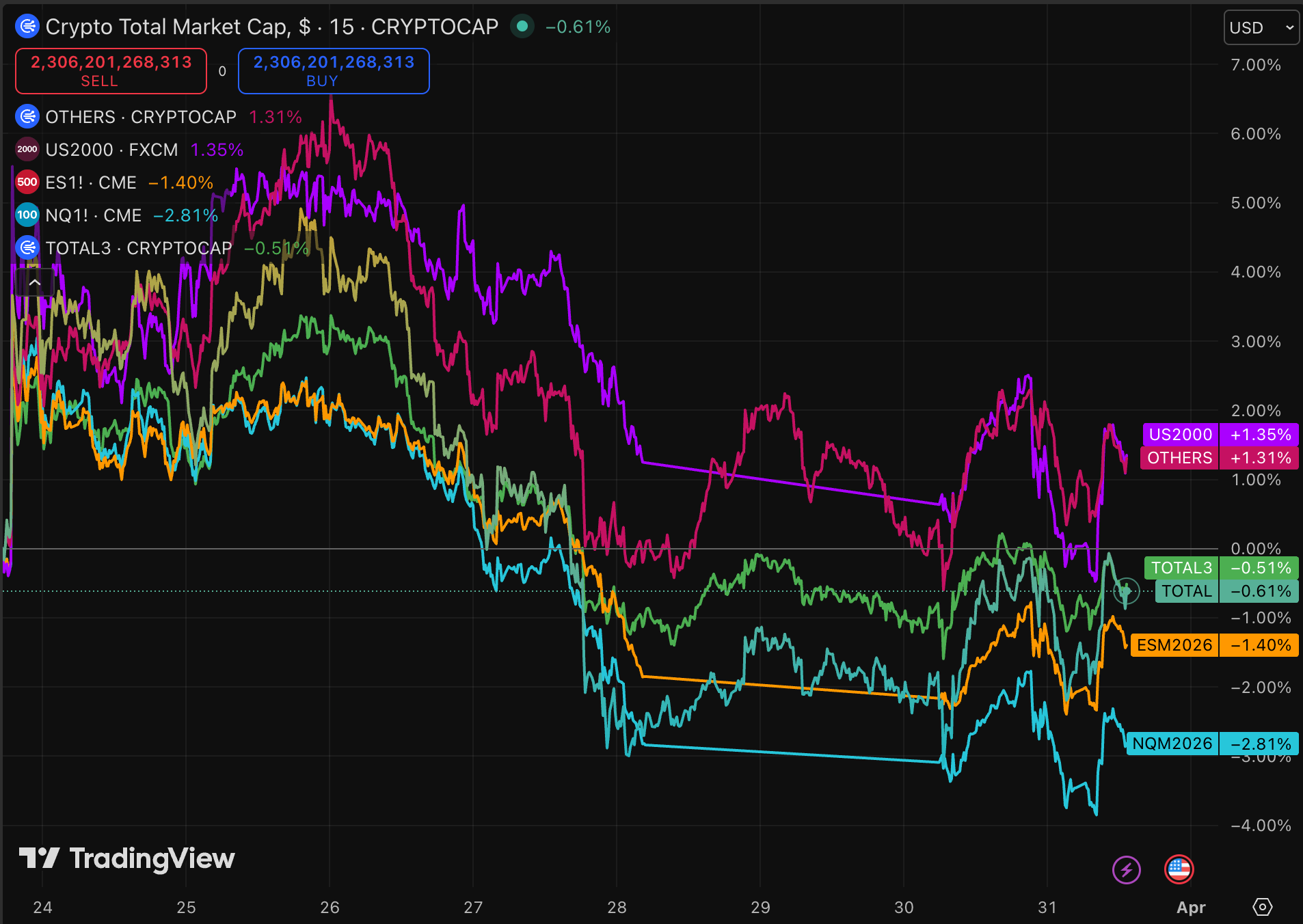 本週加密市場呈現劇烈震盪。BTC 於上週末回落後於週初出現短暫反彈觸及本週最高價 72,000 美元,隨後回落一度跌至本週最低價 65,000 美元。3 月 26 日與 27 日發生顯著波動,BTC 急跌逾 8% 觸底後迅速 V 轉,目前於 67,700 美元位置徘徊等待新一輪方向。ETH 走勢高度連動,最高接近 2,200 美元,最低插針至 1,940 美元,同樣於 3 月 26 日與 27 日出現逾 8 % 跌幅。