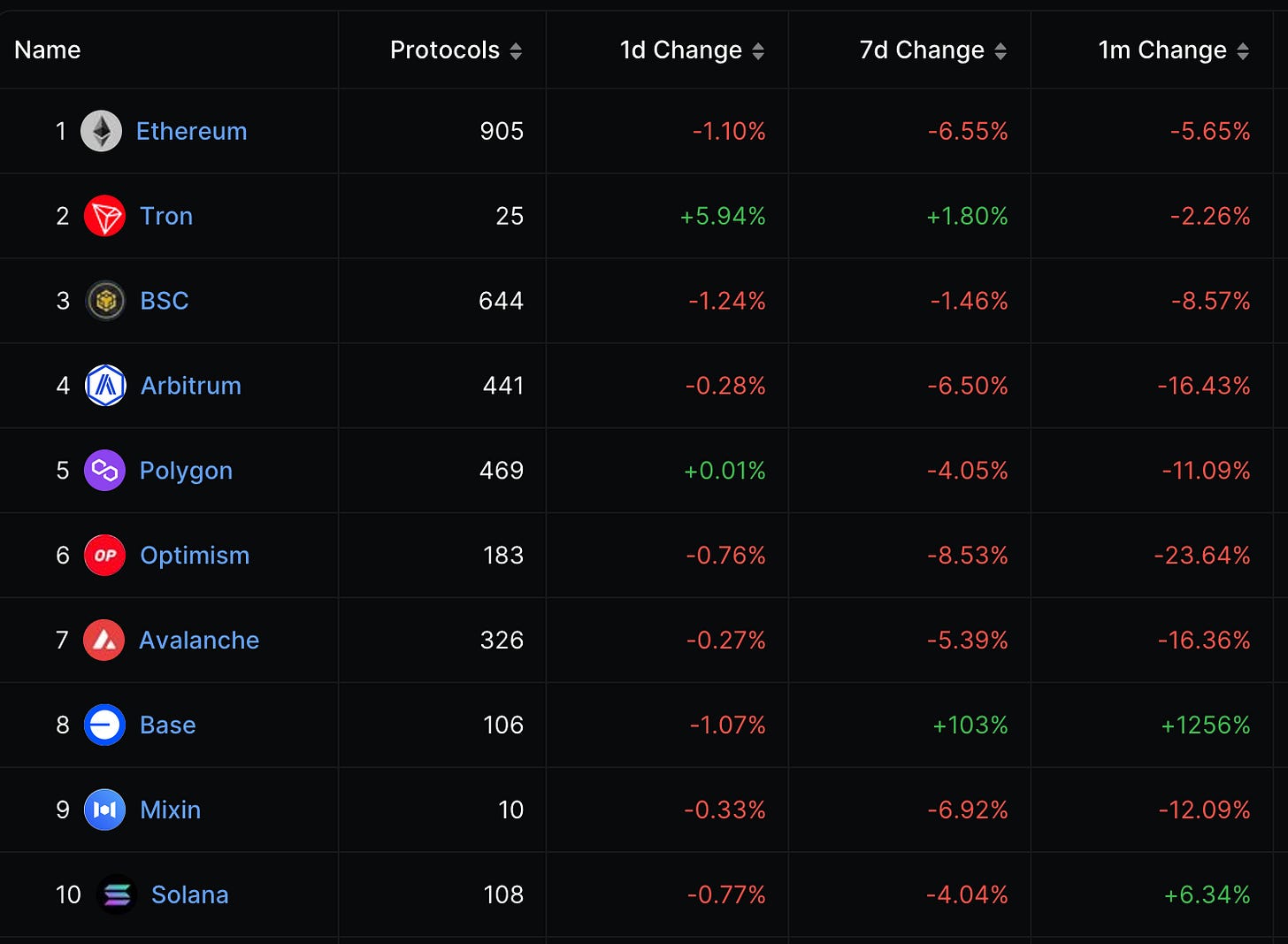如前文所述,本週前10大公鏈大多數呈現下跌趨勢,只有 Base 這一條 Layer 2 呈現單週 103% 的驚人漲幅。