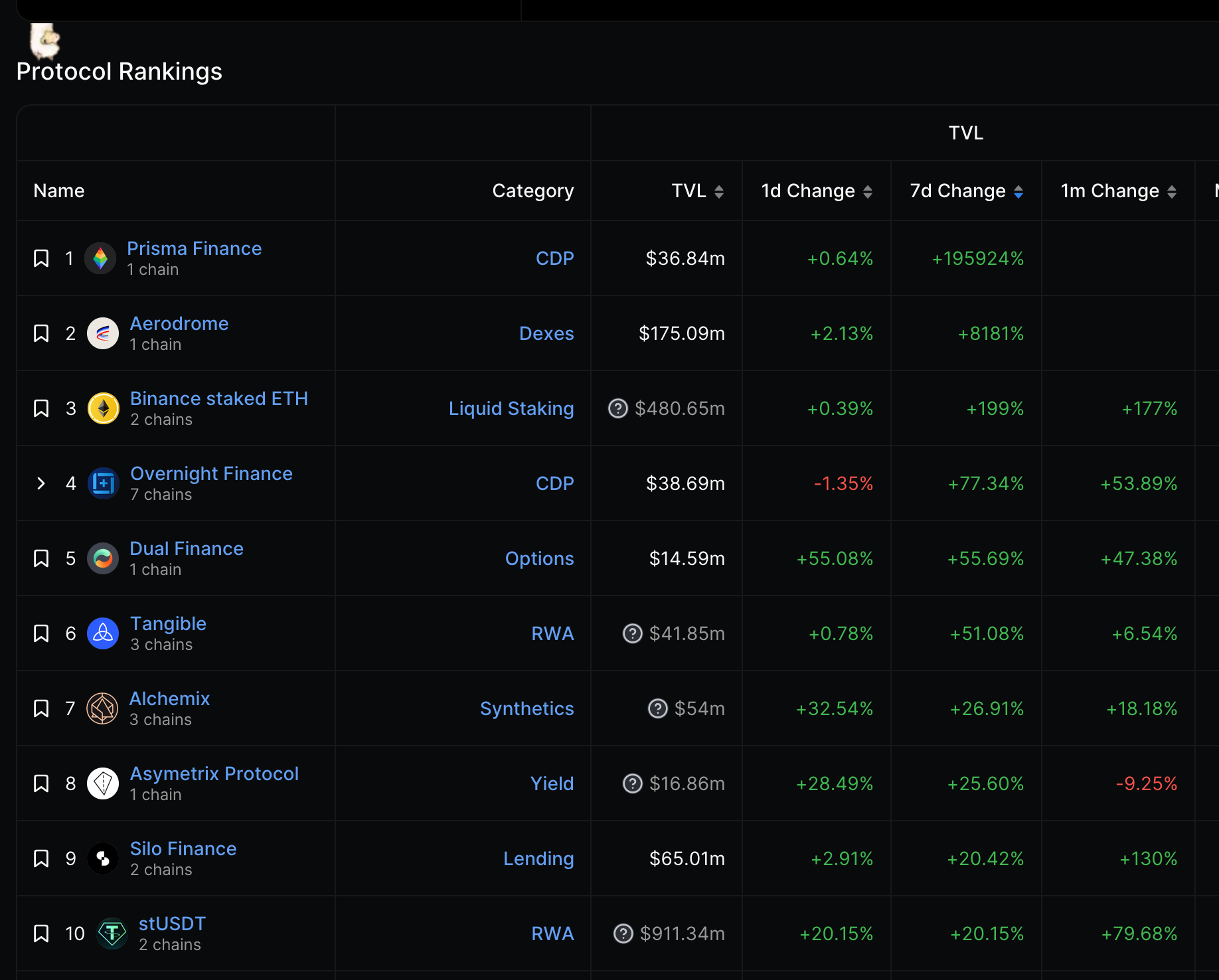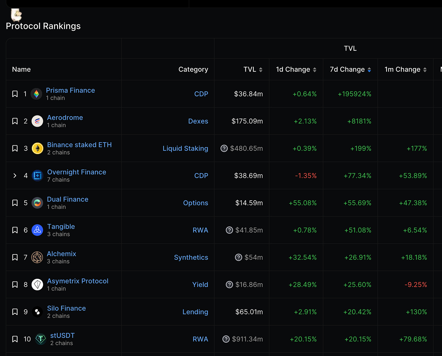 本週 TVL 高成長協議為為新興超額抵押穩定幣協議 Prisma Finance