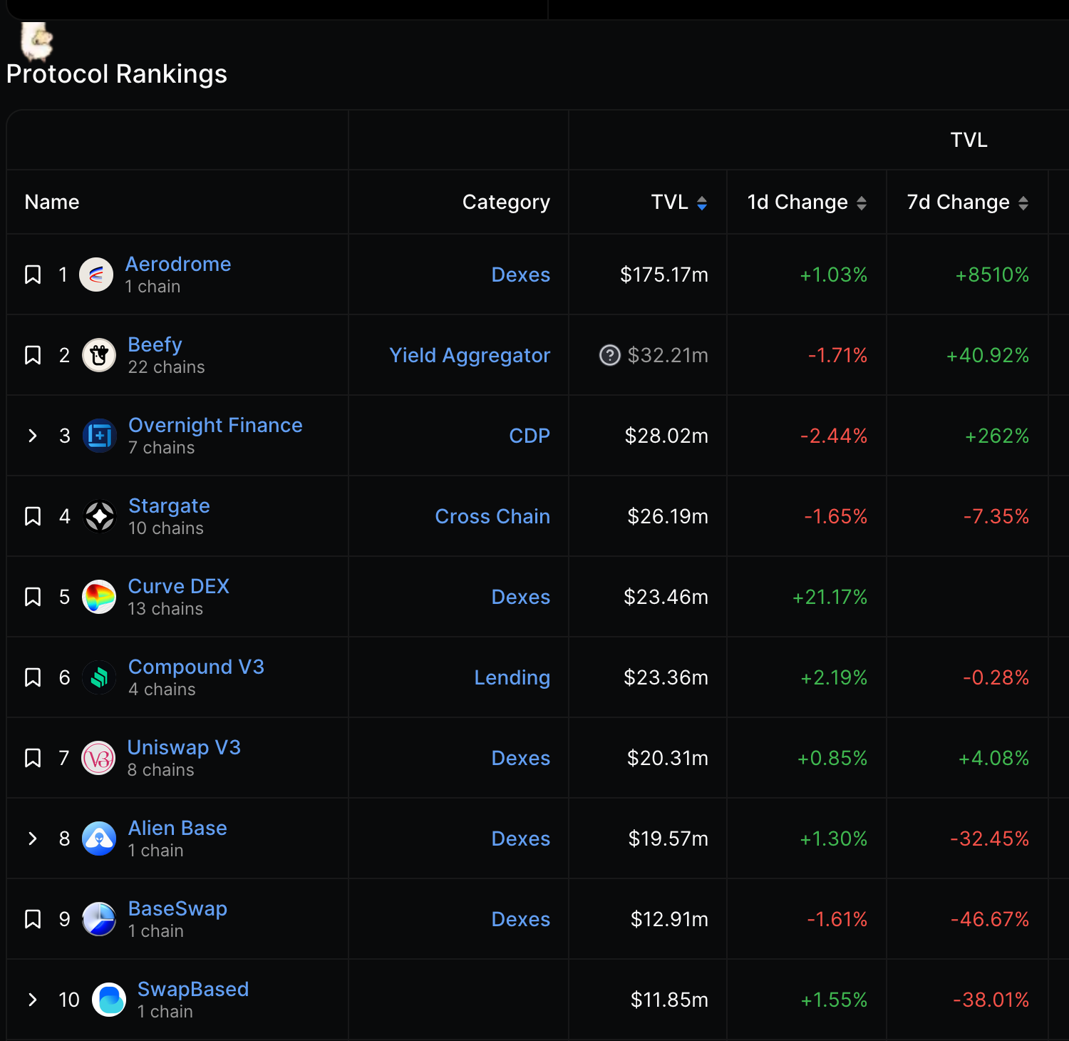 再進一步深究,可以發現 Base 的鎖倉量暴增可以歸功於 Aerodrome 這個協議。該協議總鎖倉量為 1.75 億美元,七日上漲幅度高達 8510%