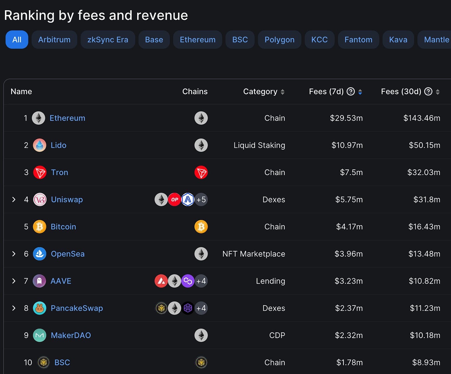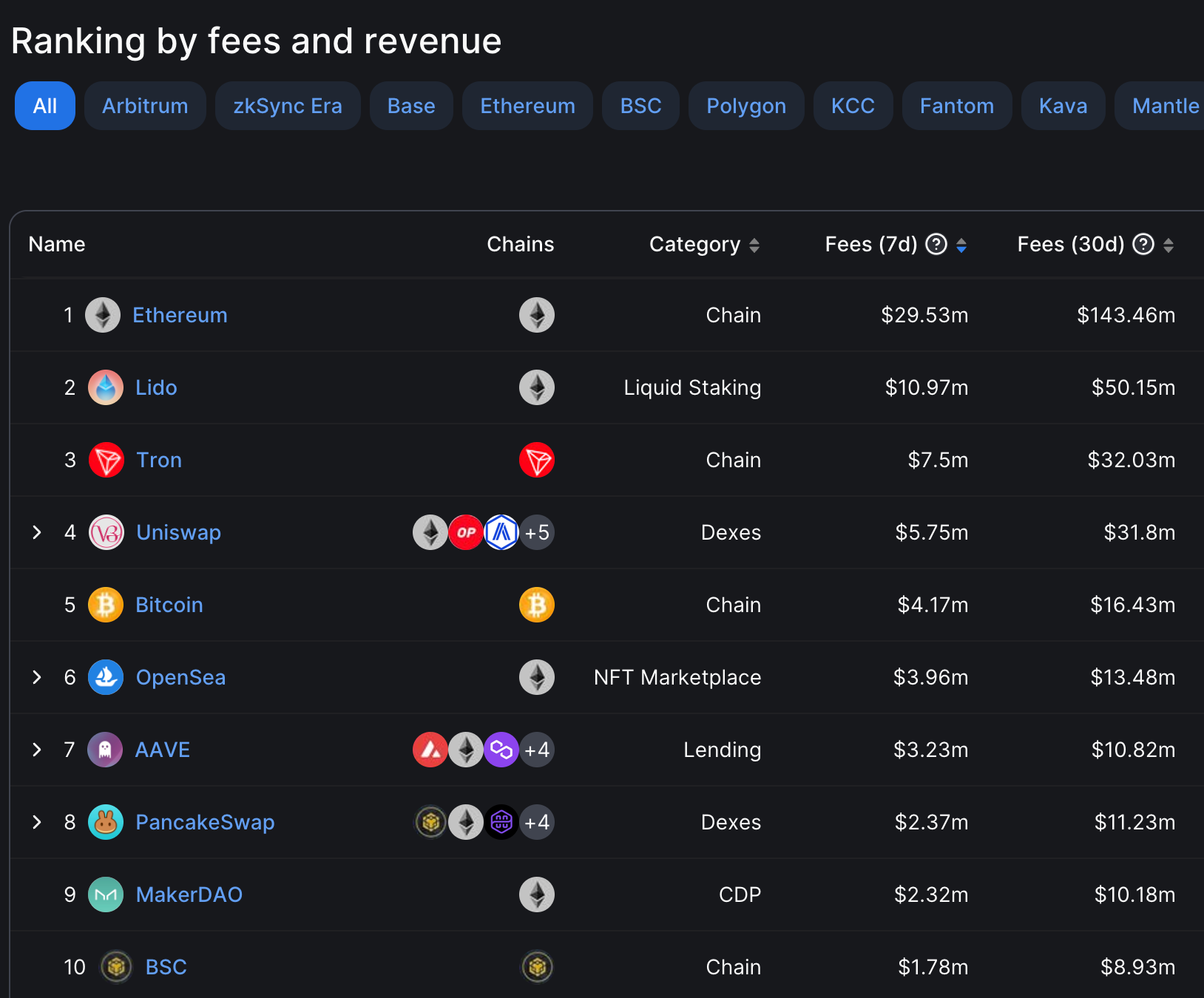 前10名回歸至大型藍籌 DeFi ,連續兩週上榜的 FriendTech 明顯退燒,跌出 10 名之外。