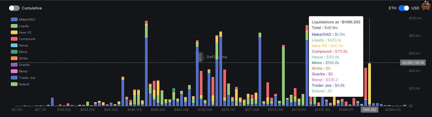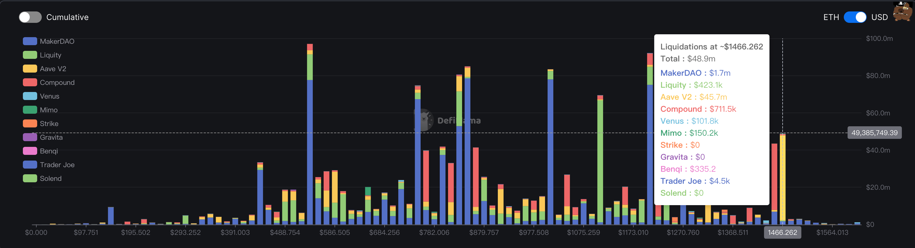 最近的清算點位為 1466,規模約為 4890 萬美元,其中以 Aave 上債務佔大多數。