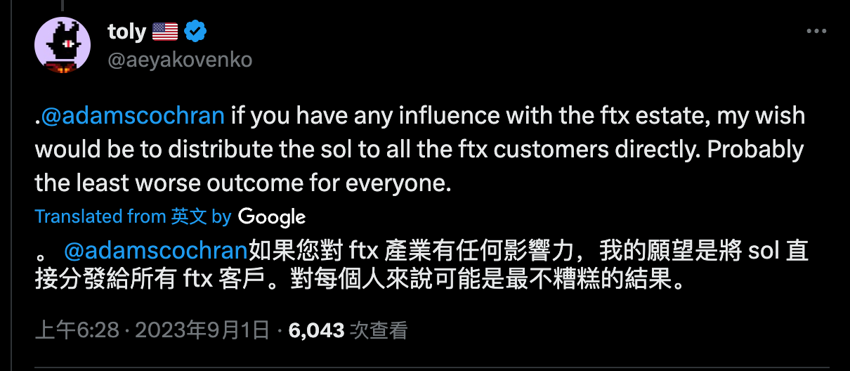 而 Solana 共同創辦人 Anatoly Yakovenko 對此情形表示:「我希望 FTX 可以把 SOL 發給他們所有的客戶,這應該是最不糟的結果。」