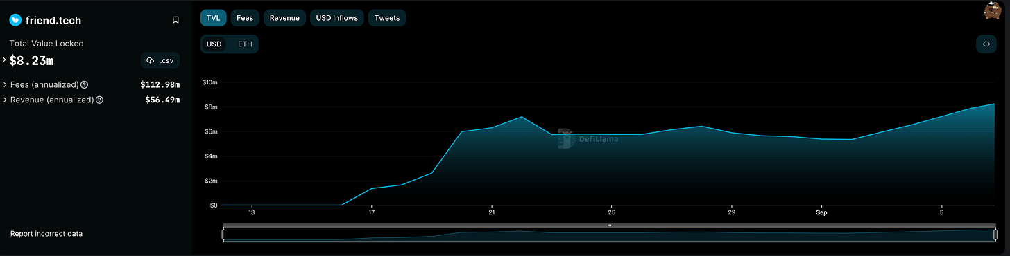 此外,即使推出即火熱的 socialfi FriendTech 交易量距高點已有 80% 的回撤,TVL 也在今日來到了新高,超過 800萬美金,非常不可思議。