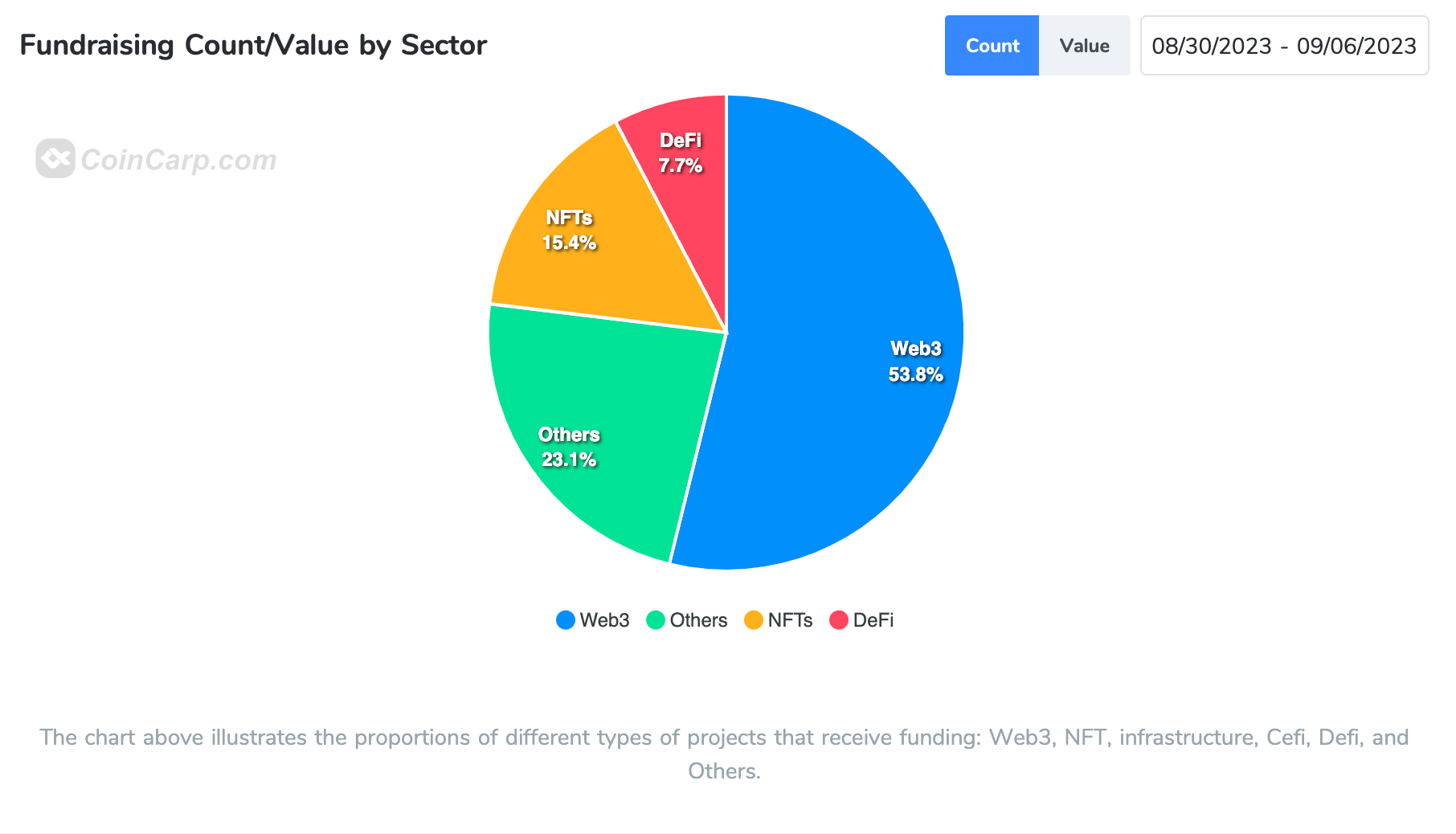 本週融資情形,分類以 Web 3 為主,佔比 53.8%,另外以其他(如 ai) 以及 DeFi 兩者相加占比約 4 成