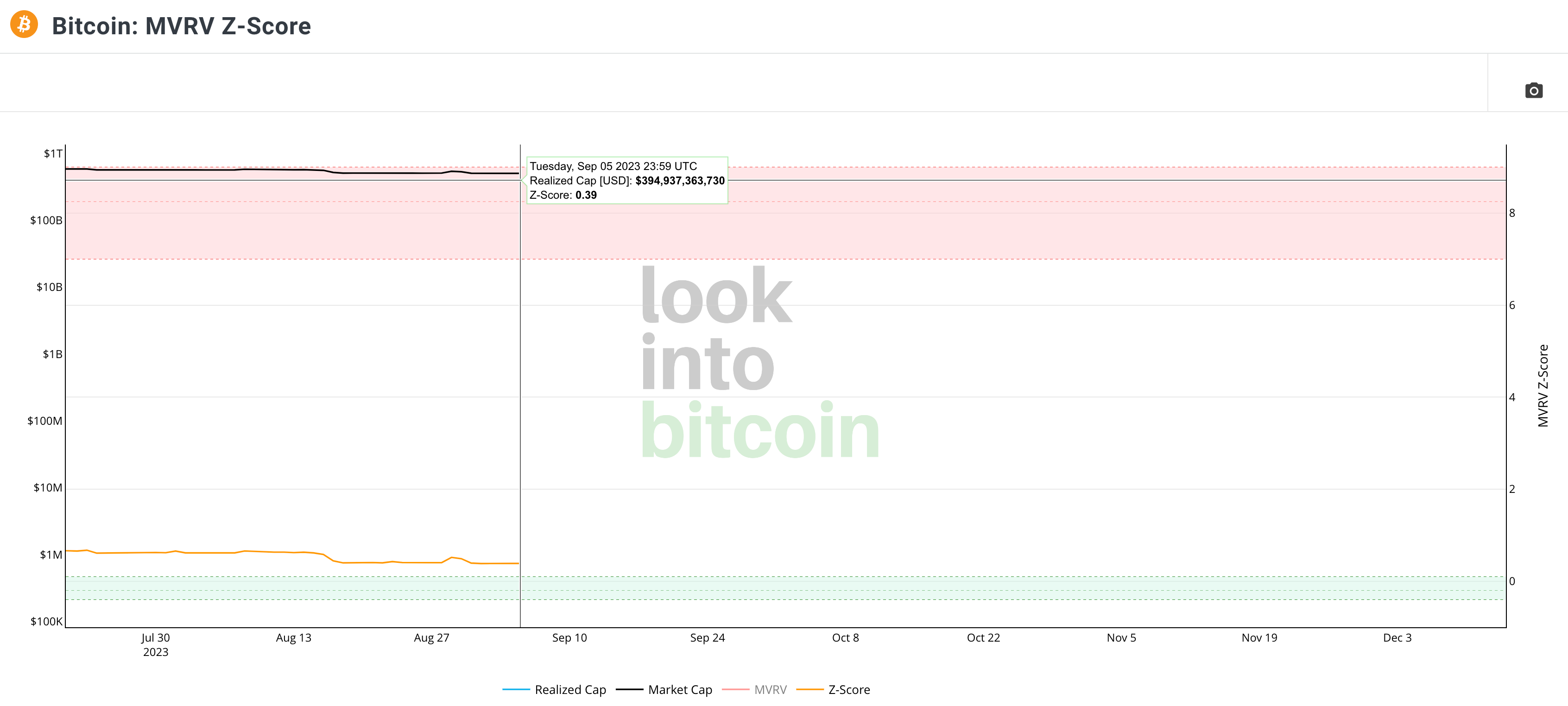 比特幣 MVRV-Z 指標:0.39,隨著幣價一起有感下跌(上週0.52,小於0買入)