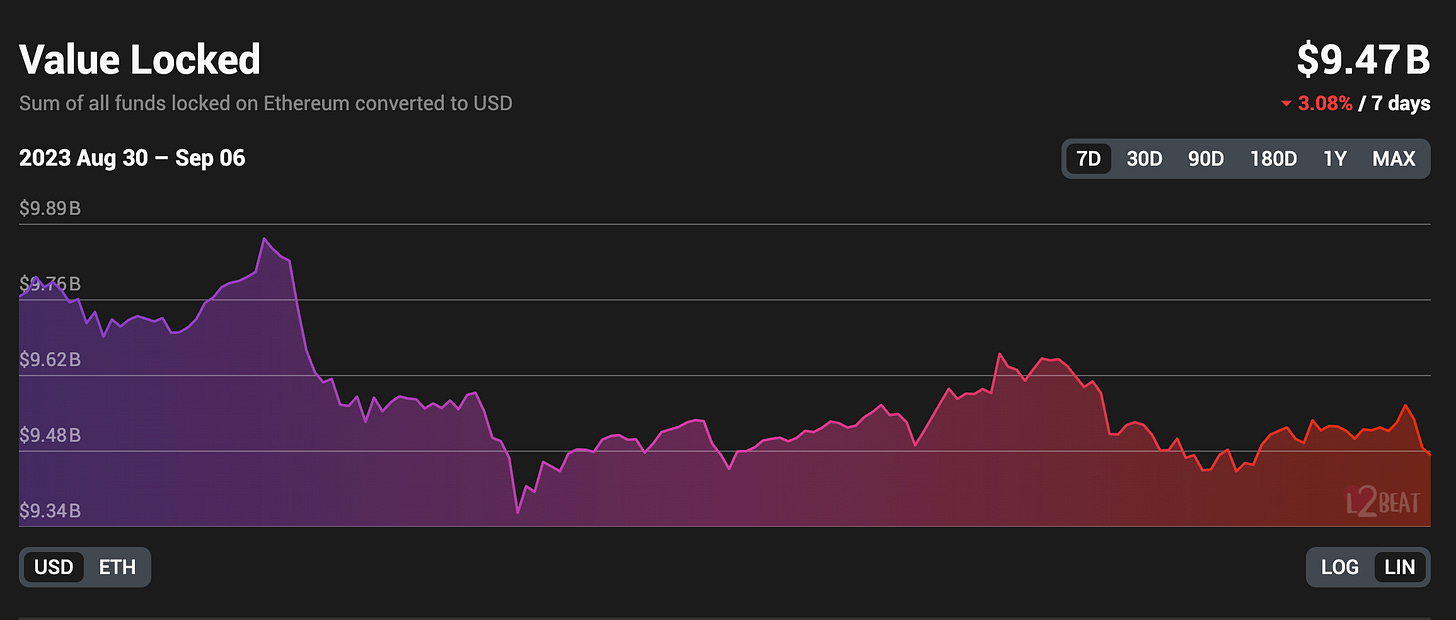 本週下跌3.08%,鎖倉量與幣價跌幅同步。
