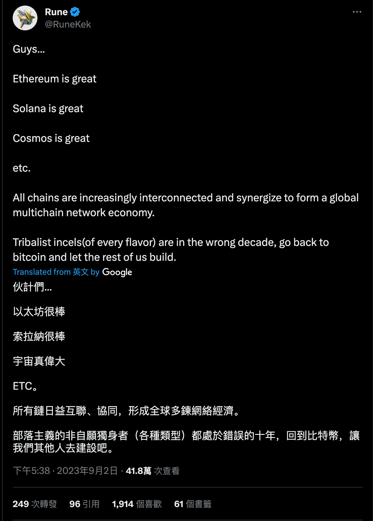 而隨後 MakerDAO 創辦人 Rune 發文救火:「嘿大家,以太坊很棒,Solnan 很棒,Cosmos 也很棒,現在是多鏈連結的時代,部落主義者可以回到比特幣,就讓我們建設吧。」