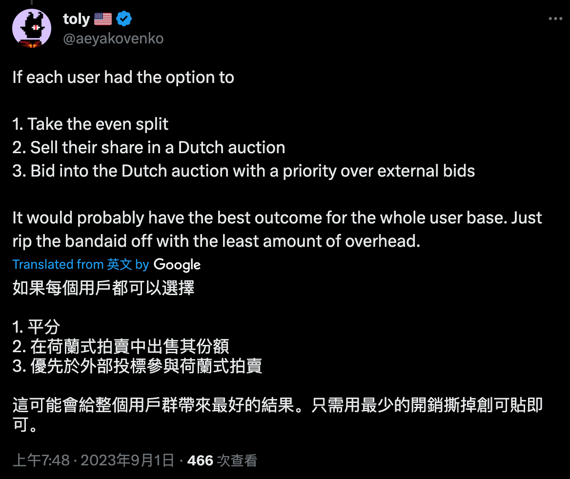並接著說道:「從長遠來看,分發給 500 萬個用戶是雙贏(用戶與 Solana),用下面這三個方法:平分、荷蘭拍、優先出價式荷蘭拍都比被律師偷走還好(意指 FTX 高昂的法律服務費用)」