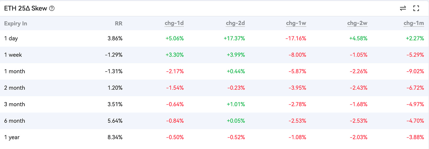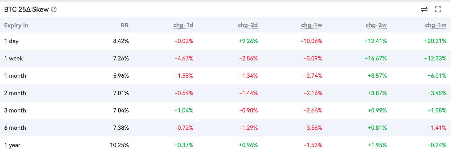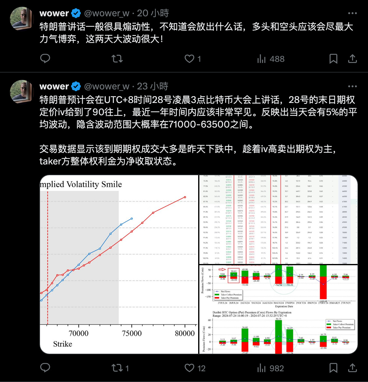 數據顯示 BTC 行情樂觀,仍保持著全多狀態,一天內 & 一週內到期的期權數值超越一個月內期權數值,呈倒掛狀態,大部分人樂觀認為川普於東八區時間 7 月 28 日 03:00-03:30 的演講將有新消息使比特幣價格上漲。