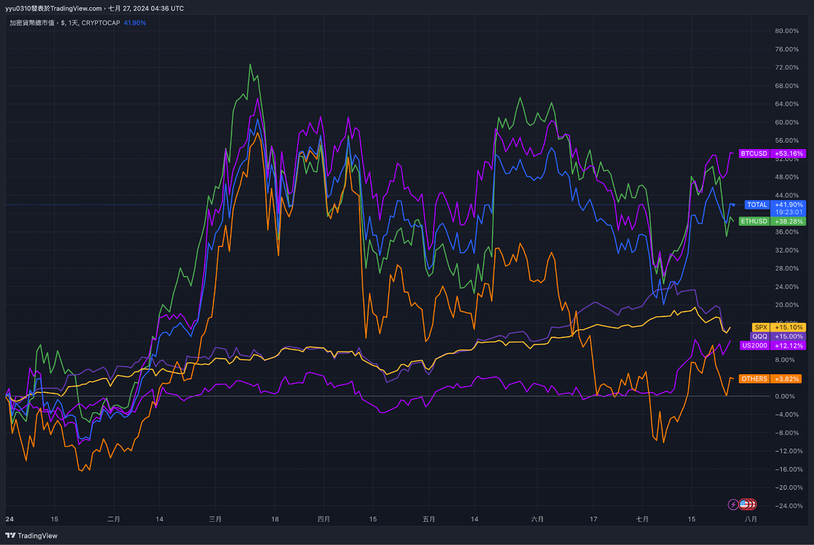 加密市場於年初突破至新高,在接下來的數個月大盤持續盤整未破新高,而後代表山寨幣市場的 OTHERS 已從 3 月跌回年初水準。整體來看今年以來加密貨幣的漲幅仍然贏過美股。