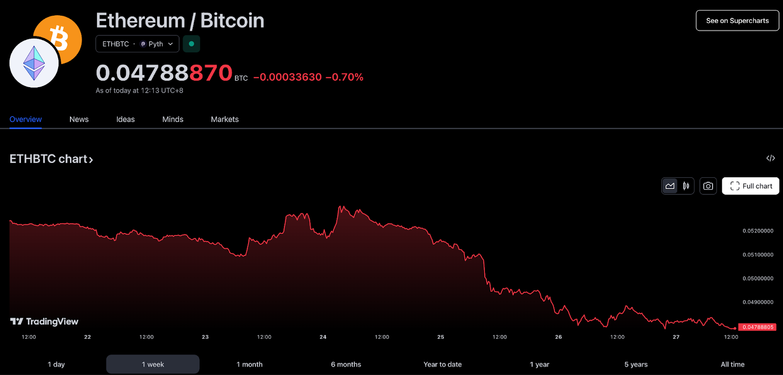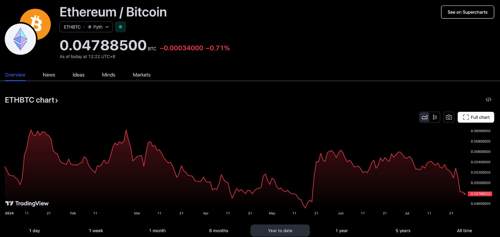 ETH/BTC 跌破了維持兩個月的區間 0.052-0.055,來到 0.047 的 2024 年低點,理由可能與 ETH ETF 開盤第一週流出有關。