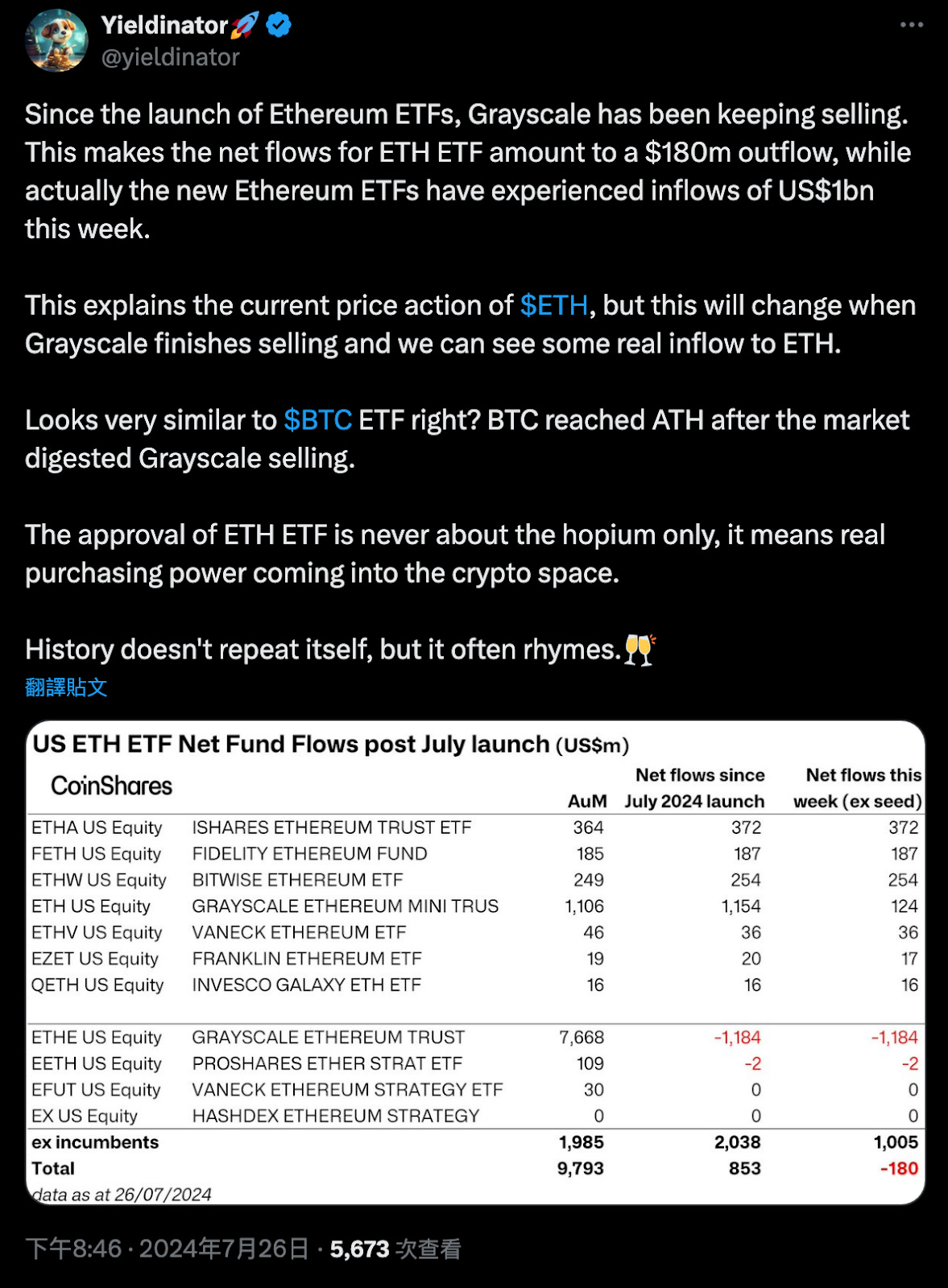 根據 Yieldinator 推文,開盤第一週灰度大幅流出 11.8 億美金;其餘 ETF 穩定流入 10 億美金,走勢與 BTC ETF 開盤第一週相同,待灰度流出完畢,筆者認為市場將迎來 ETH 價值穩定成長,到時山寨季就不遠了。