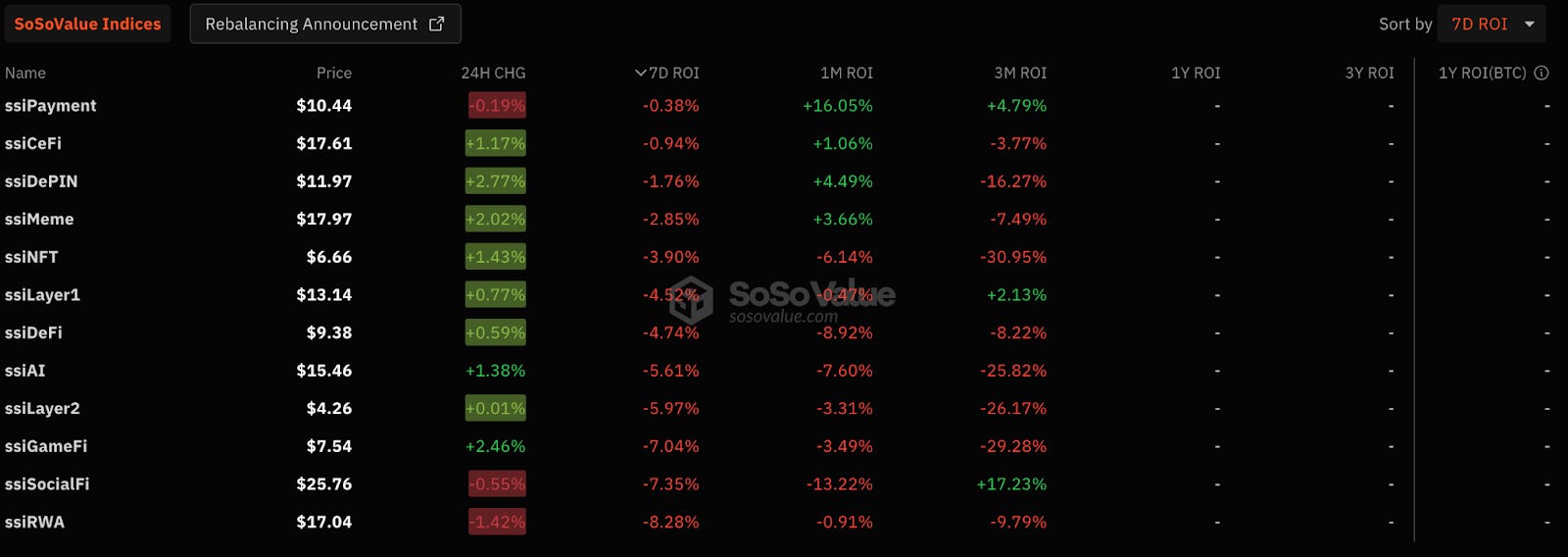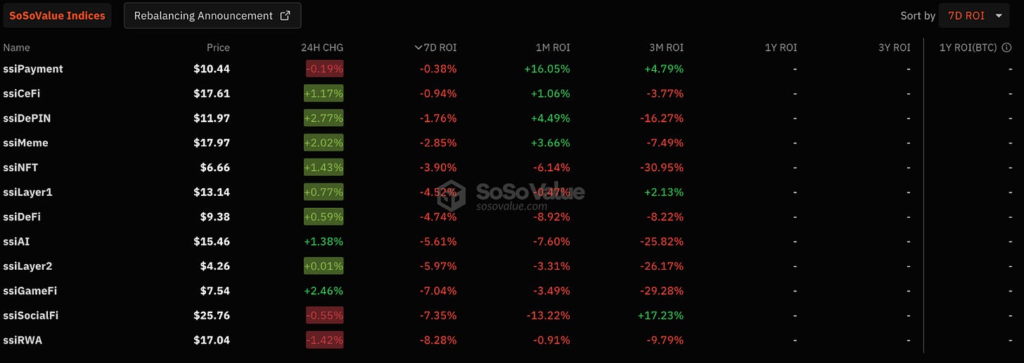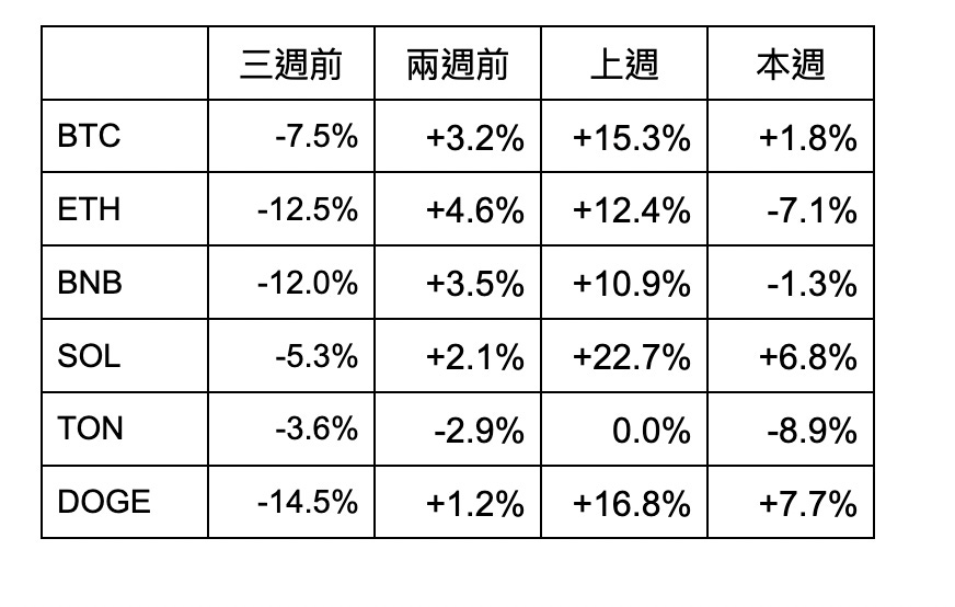 本週各賽道均下跌,其中被歸類於 Payment 賽道的老項目如 XRP、BCH 跌幅較低,其次為 CEX 代幣較抗跌。