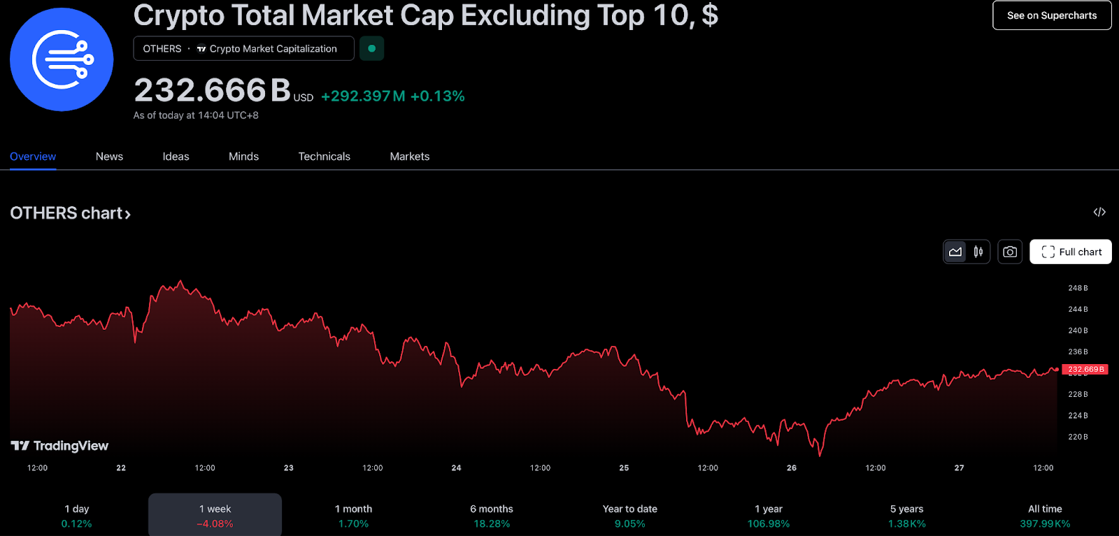 OTHERS 前十大幣種以外的加密資產市值,可以顯著呈現目前山寨幣的行情。