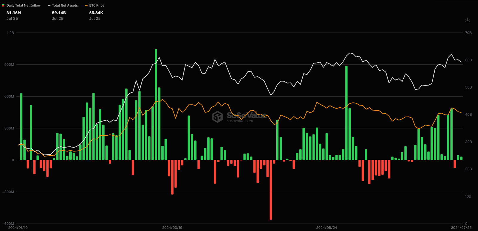 BTC ETF 本週增量流入至週末趨緩,總持倉資產曾一度來到新高 620 億美元,近期有數日流入金額皆超過 4 億美元。中期來看無明顯趨勢。