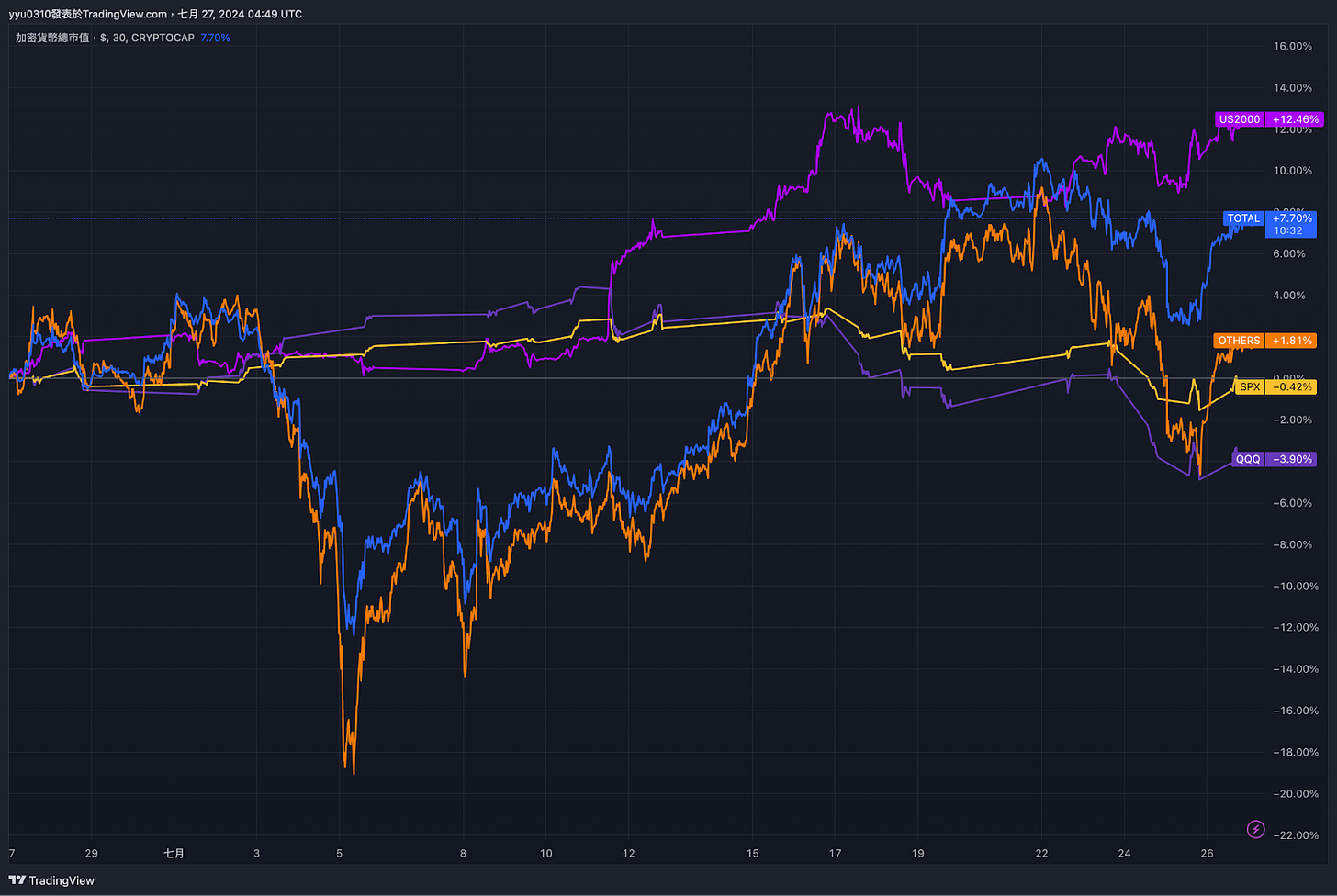 近幾個月美國釋放流動性的消息以及降息預期持續釋出,代表小型股的羅素 2000 指數率先反應,表現最佳。隨全球經濟進到降息循環,可以推測增額流動性帶來漲幅也將發酵至加密市場甚至山寨幣市場。