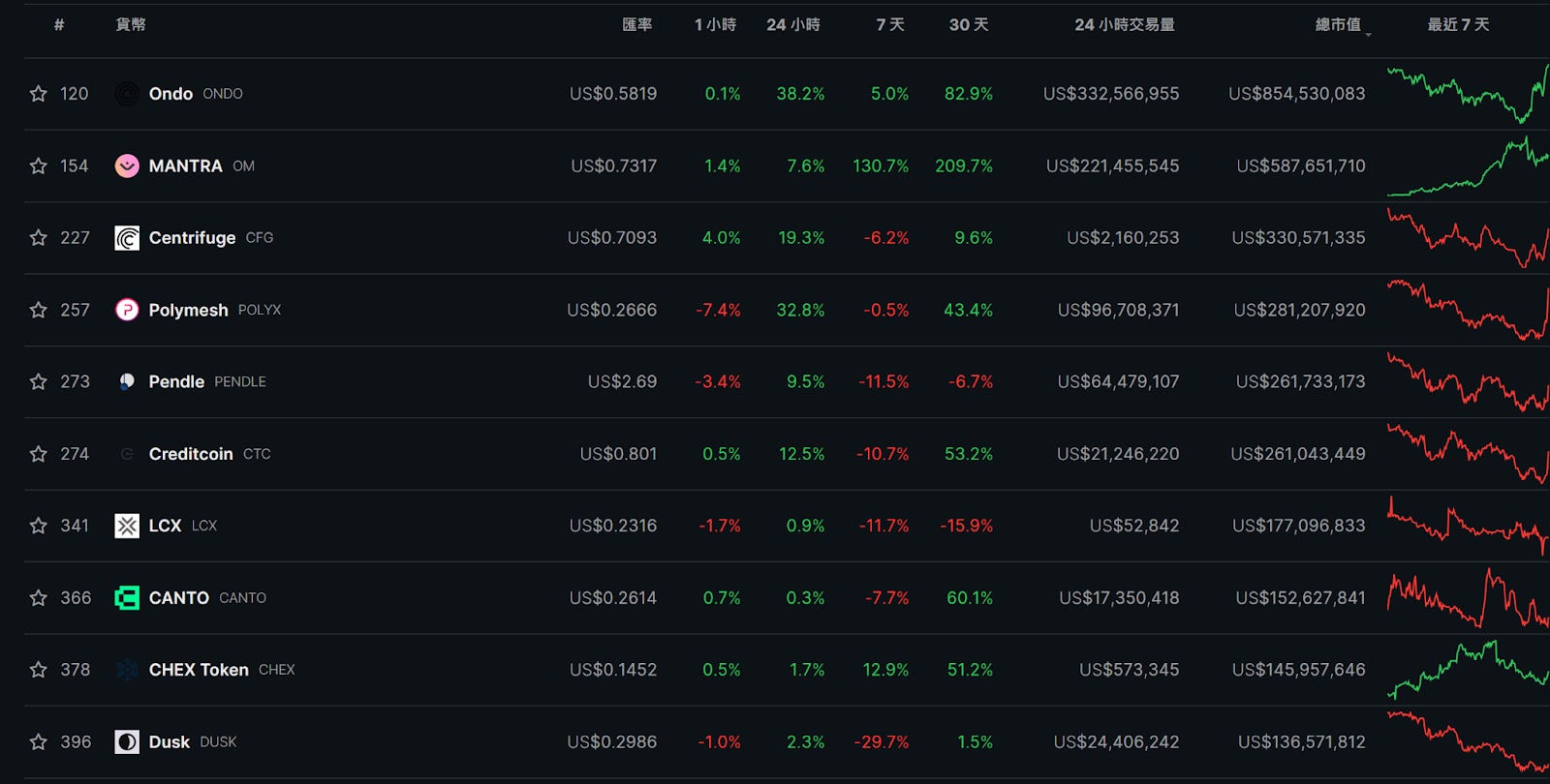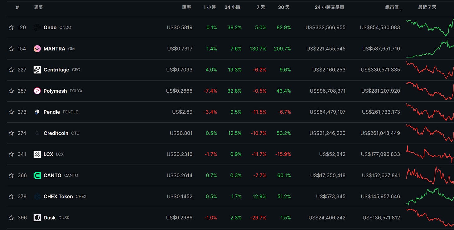 Aptos 生態中上榜的有 Cellana Finance、Aptin Finance,兩者分別為 DEX 和借貸項目,從這基礎 DeFi 的上漲中可以看到這條公鏈在本周熱度上升,接下來可持續關注此生態及其布局於本輪牛市的 RWA 敘事,著名項目有大型傳統金融機構支持的 Ondo Finance。