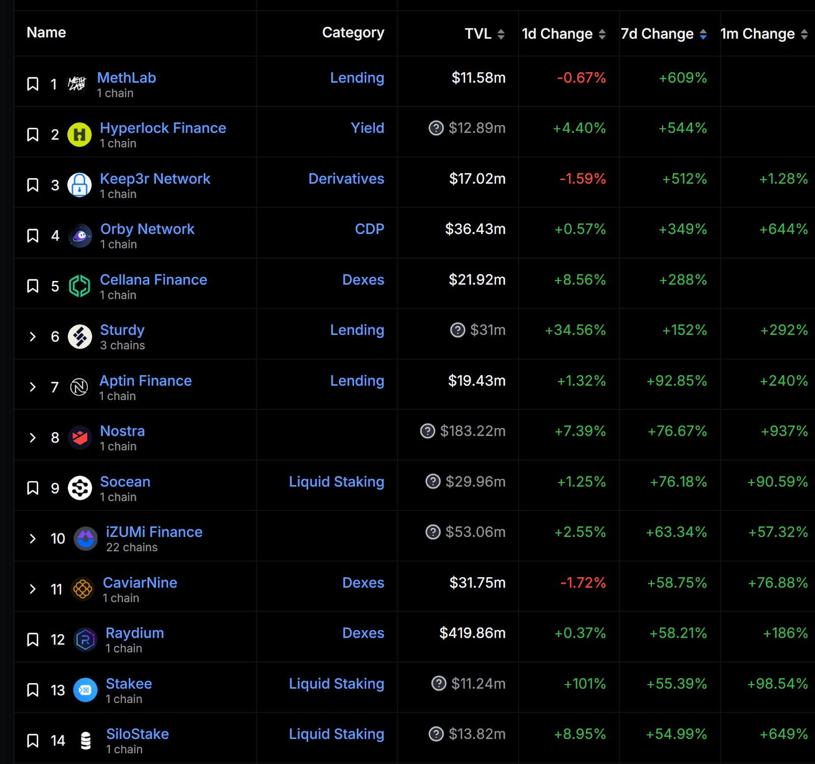 漲幅最大項目(TVL 大於 10M)