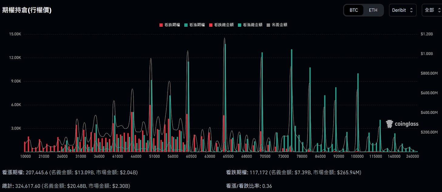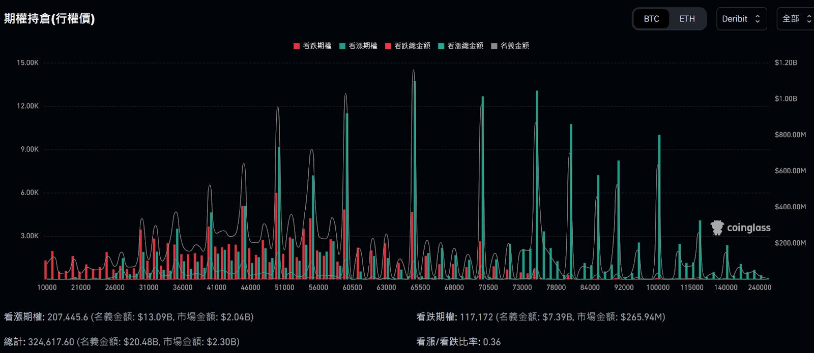 從 Deribit 上可以看到擅長選擇權的交易者目前主要瞄準 BTC 或 ETH 在哪一個價格。以目前全時段的 BTC 選擇權來看,看漲/看跌比率為 0.36,數值小於 1 代表整體市場是看跌的。