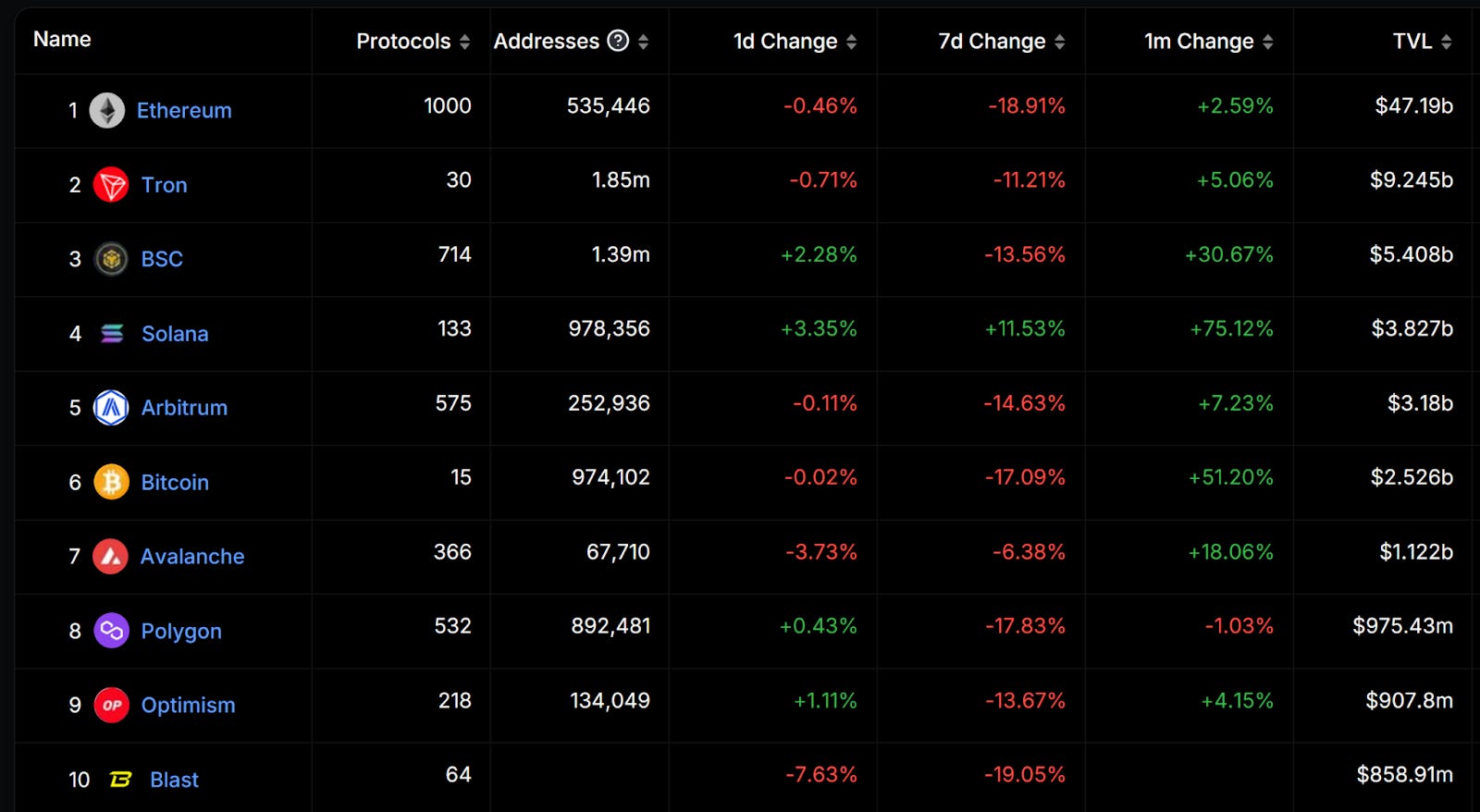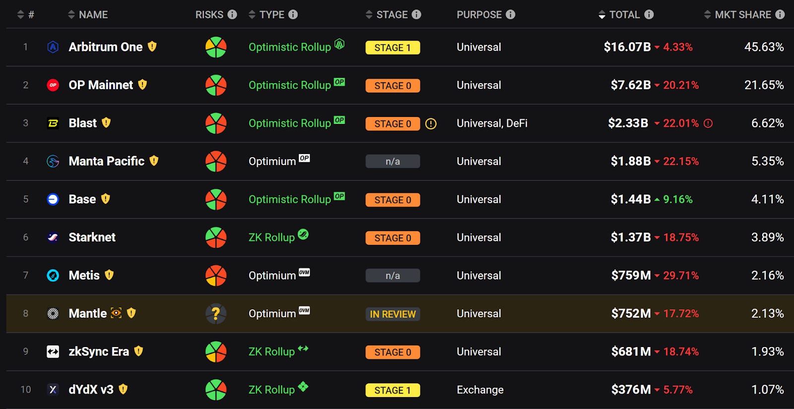 Rollups 前十名中除了 Base 之外其餘均下跌,今日 Twitter 各大 KOL 在討論 Base 的動態,很有可能接下來這幾週 Base 將承繼 Solana 的熱度,成為逆勢上漲的低 Gas Fee 鏈。