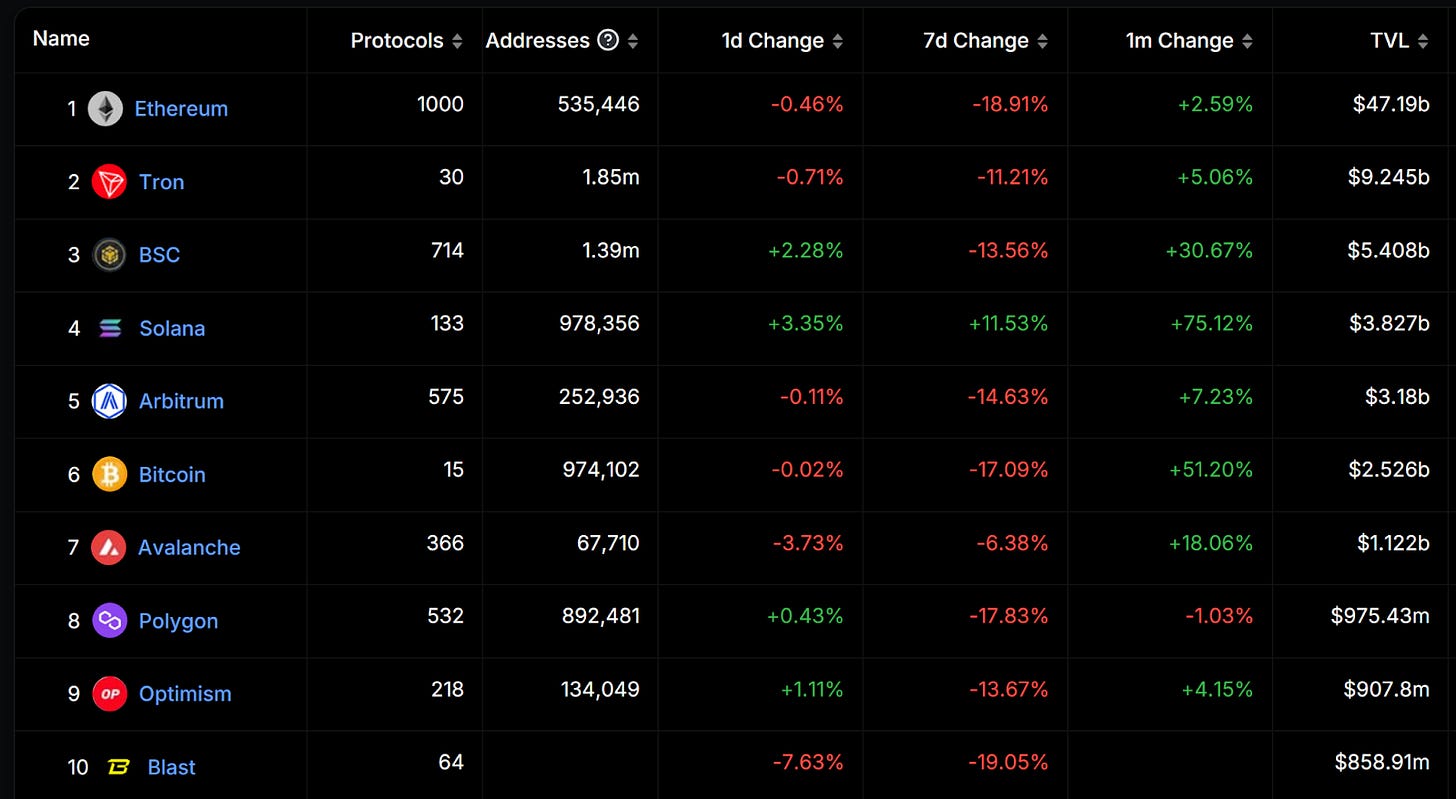 本周前十大鏈中,可以看到 Bitcoin、以太坊主網、EVM 公鏈生態均下滑,僅 Solana 和上週對比仍上漲 11.53%,但近兩日也處於下滑狀態,主要原因仍為大盤幣價下跌,若是從幣本位看則無明顯衰退。