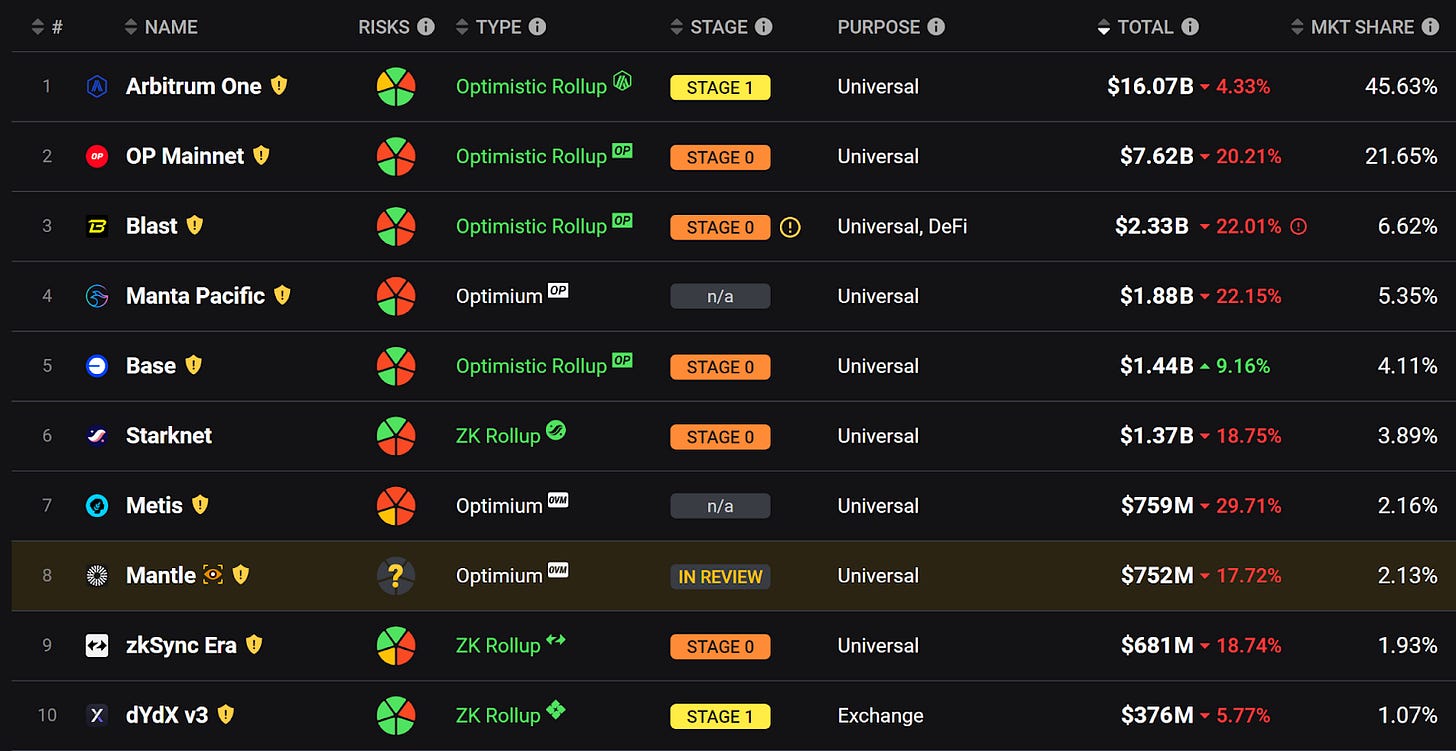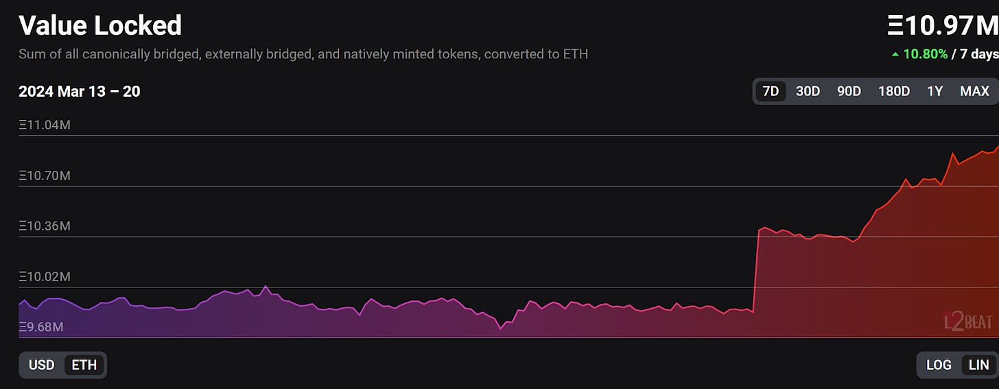 本週 L2 總 TVL 下降 12.49%,主因為 ETH 幣價下跌; ETH 為單位的 TVL 上升 10.8%,可見坎昆升級之後,L2 吸收了許多來自 L1 的 ETH,可預期 L2 接下來能夠更蓬勃發展,目前多鏈百家爭鳴的情形導致流動性分裂以及使用者進入門檻高的問題,有賴鏈抽象項目,如 Polyhedra,在未來 ZKBridge 實際落地並獲得大量採用後解決,同時也可以展望下一次以太坊 的大阪升級,更進一步使無狀態客戶端的技術落地。