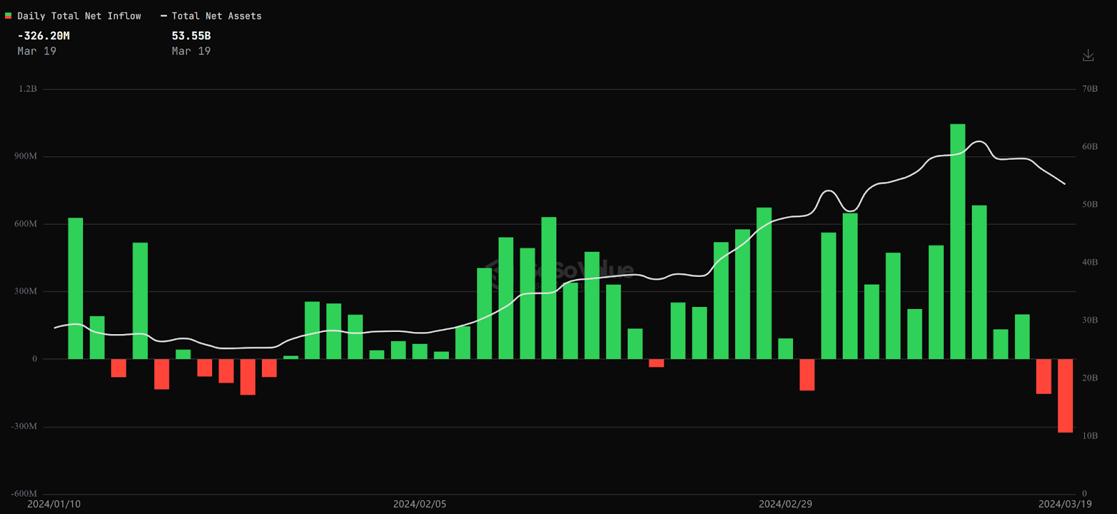 目前 BTC ETF 總淨資產為 535.5 億美元,佔總市值 2.25%,從 3/13 淨流入 5.35 億美元,但前半週流入減緩,至最近兩天持續大額流出。部分交易者認為 BTC ETF 出現之後會使傳統金融取得強大訂價權,未來可以持續觀察此指標的流入減緩或流出是否可作為 BTC 價格的先行指標