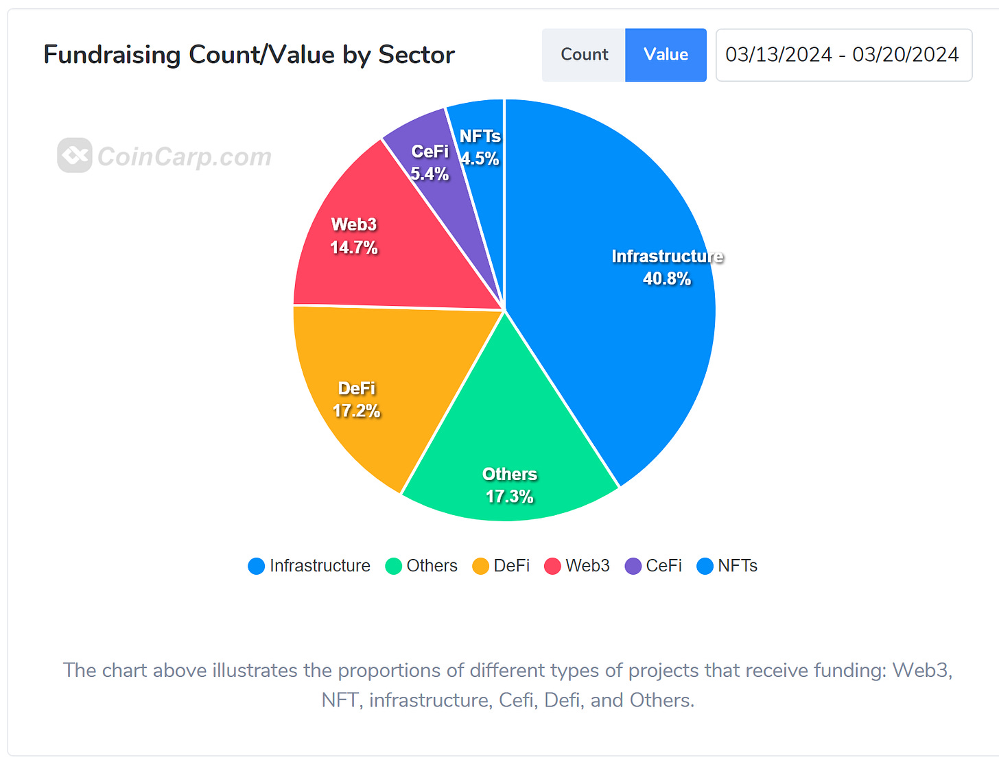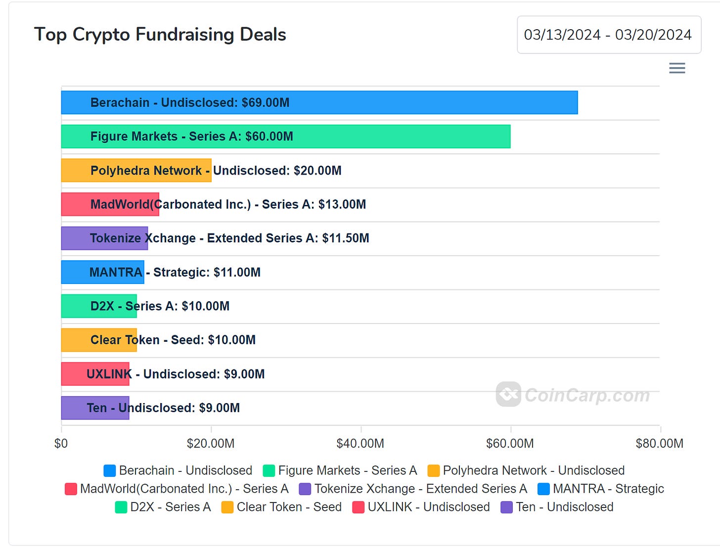 Mantra 11M,是專注於 RWA 賽道的 Cosmos 生態鏈項目,由中東地區科技產業 VC Shorooq Partners領投。此筆融資將用於構建合規的基礎設施、開發人員資金、擴大 RWA 代幣化版圖。值得一提的是,過往牽涉法律遵循的項目會比較需要傳統金融機構的支持,在融資機構中未見類似的機構,若是下一輪融資有相關的助益,將為 Mantra 帶來非常強的產品前景。