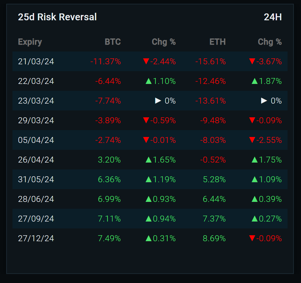 風險逆值(25d Risk Reversal)是衡量看漲期權和看跌期權價格之間的差異,具體來說就是「看漲期權價格和看跌期權價格相減後的數值」,正數代表看漲期權較貴;負數代表看跌期權較貴 ,這可以被用來衡量市場情緒對標某特定資產在一個特定時間段的漲跌方向。