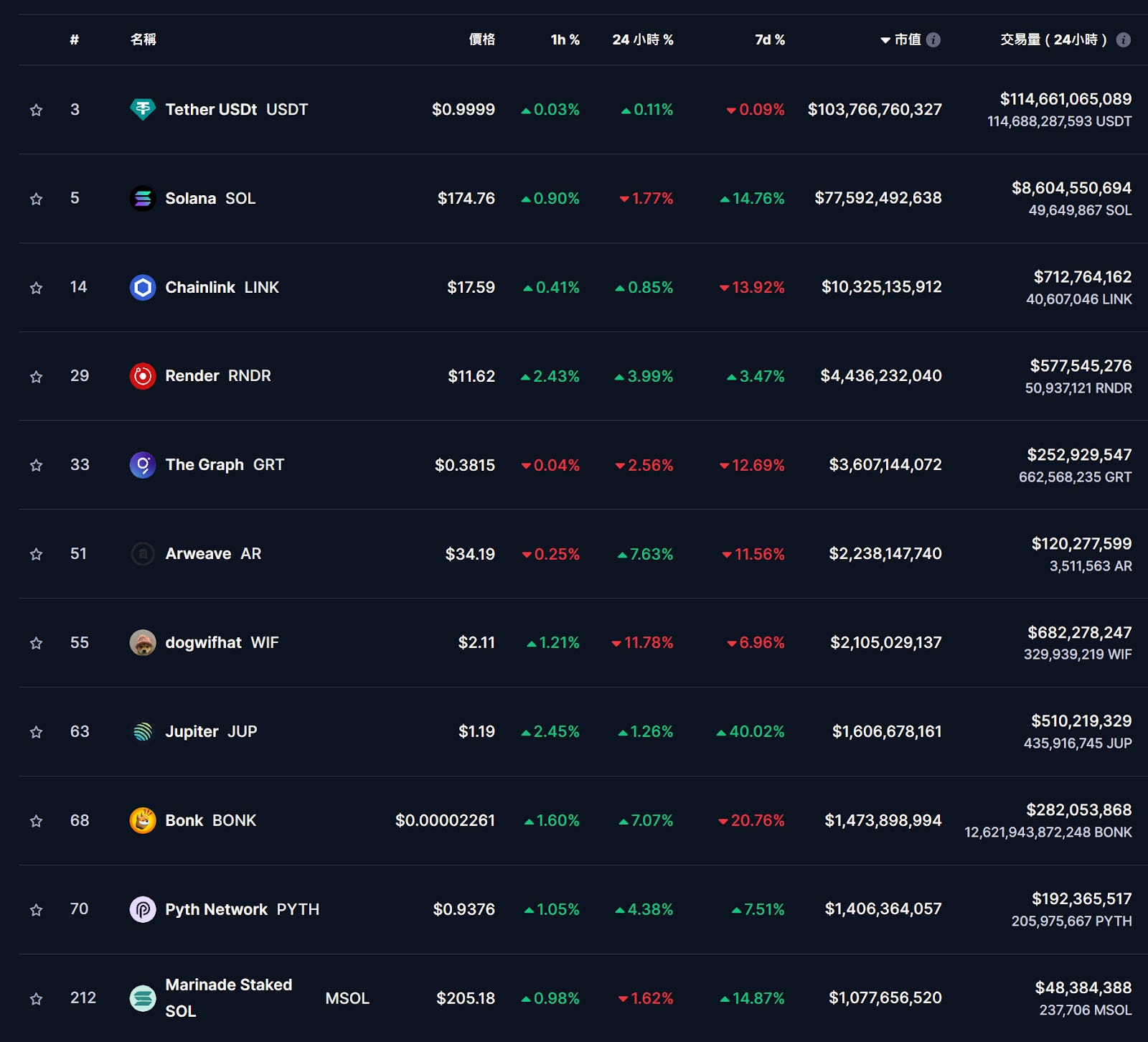 本週 $SOL 觸頂後迅速回撤,但基礎設施如 $JUP、$PYTH、$RAY 等展現一定的抗跌能力;龍頭迷因幣 $WIF、$BONK 下跌至 2.1B 及 1.47B;AI 項目 $GRT、RNDR可持續關注。