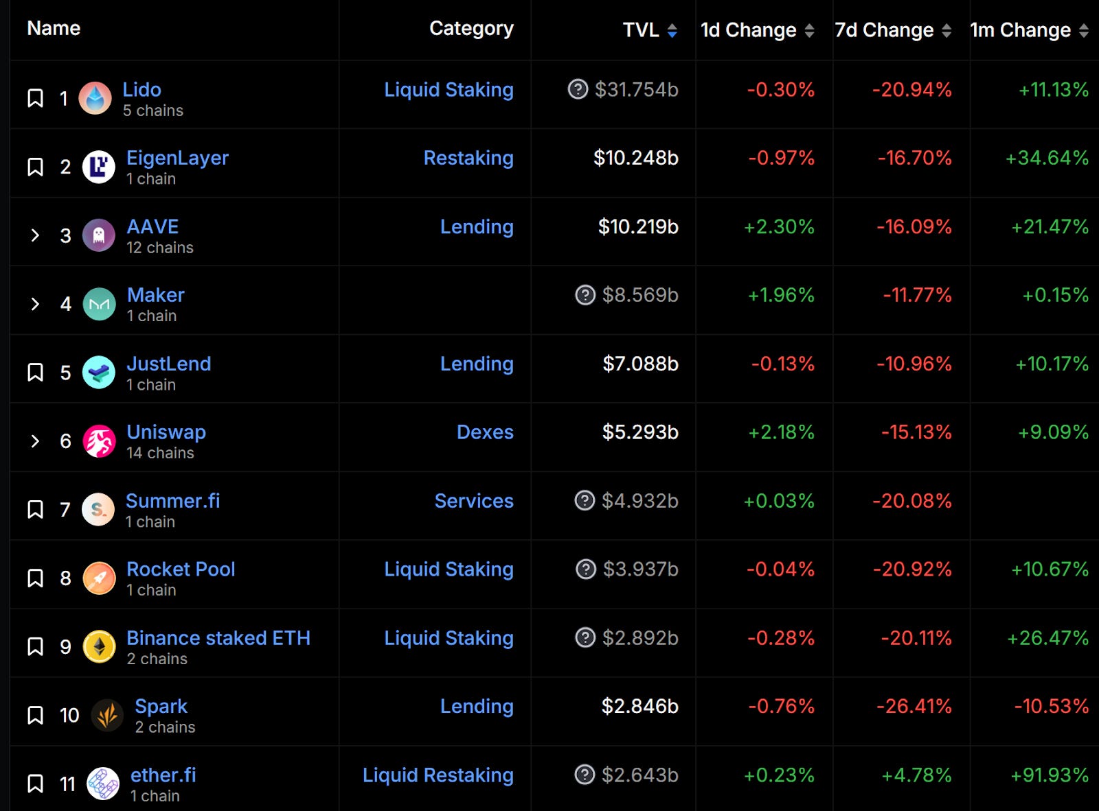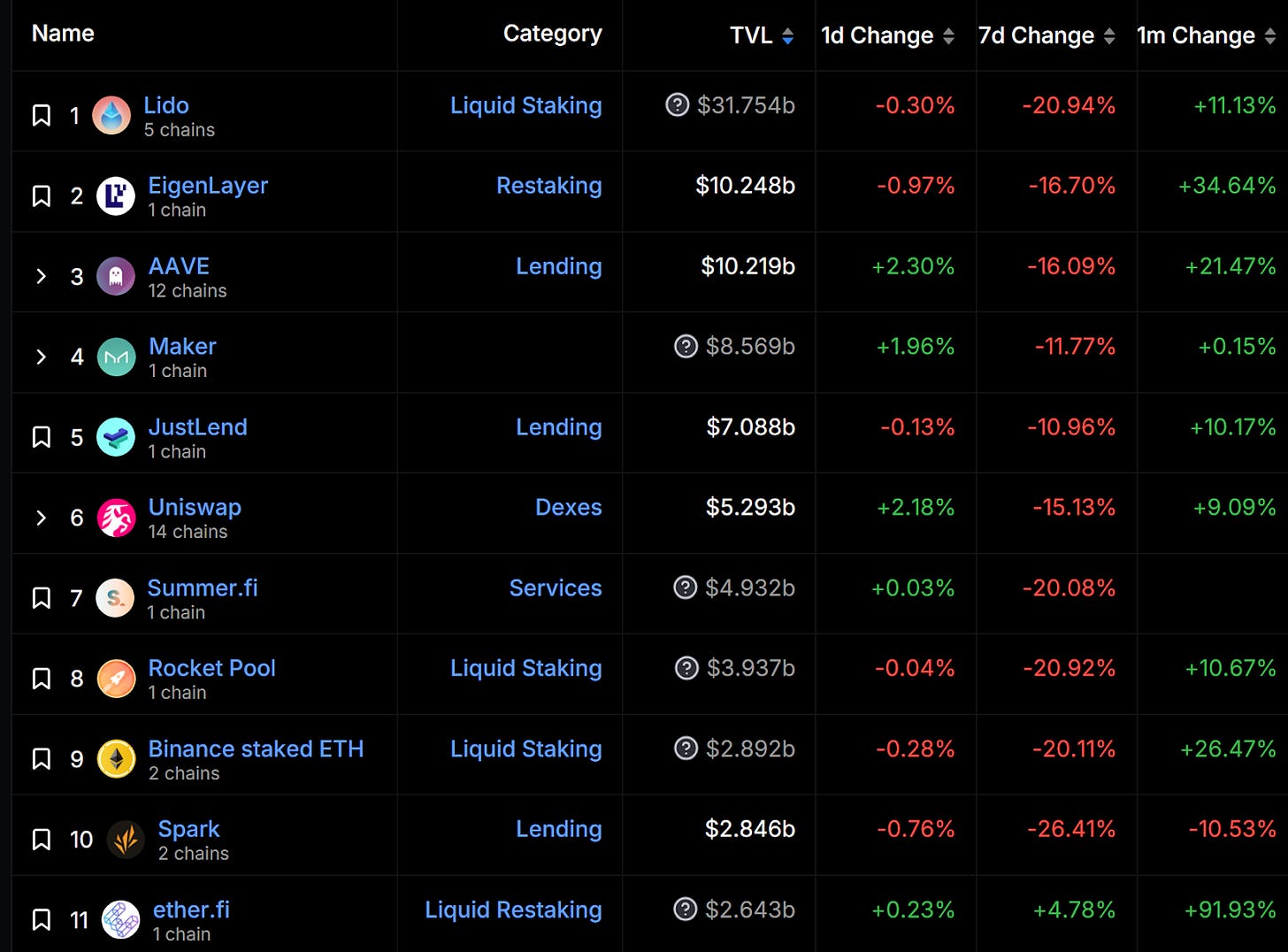 本週前十大項目大幅衰退,前十名中衰退幅度小於 ETH 跌幅 20% 的有 EigenLayer、AAVE、Maker、Uniswap,以及逆勢上漲 4% 的 ether.fi,多為藍籌 DeFi 、Restaking、LRT 項目,LSD 項目跌幅近似 20% 顯示質押率約已達到穩定態,接下來可以持續關注再質押率以及 ether.fi 等 LRT 項目。