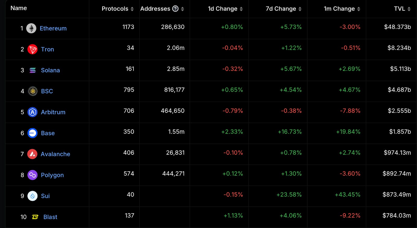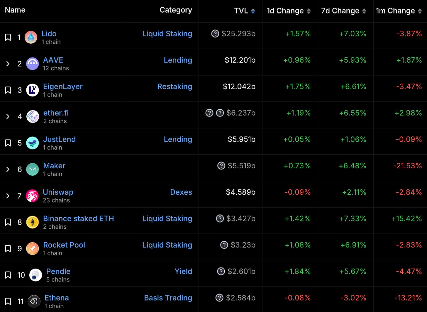 前十大公鏈排名變化不大,最近一個月 Binance 除了 ETH LST 成長迅速,也發行了 名為 $bnSOL 的 SOL LST,成長之快成為本週漲幅龍頭。