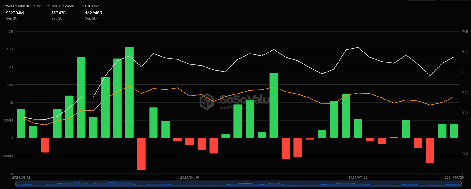 上圖為以週為單位的淨流入圖,上週 BTC ETF 睽違 3 週後再次出現淨流入,流入金額高達 4.03 億美元。上週 SEC 宣布通過 BTC ETF 期權,將加強傳統金融機構對於 BTC 的定價效率與議價能力,未來 BTC 走勢預測將更同步總體經濟、美股走勢與資金行情,來自鏈上的套利空間也會越來越小,除此之外,BTC ETF 期權的交易量也將成為傳統金融機構是否關注 BTC 的重要指標。