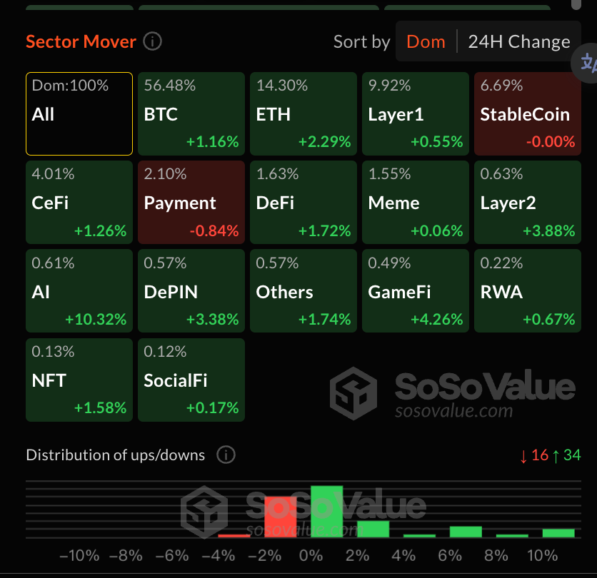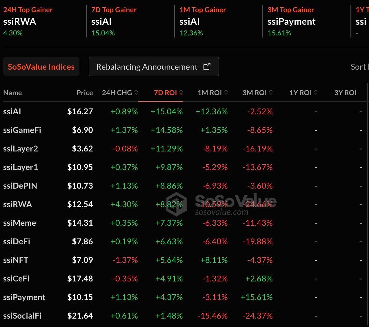 根據 SoSoValue Index,市場中最強勢板塊是 ssiAI 15.04%,一片綠的行情也代表本週加密大盤相當穩健。