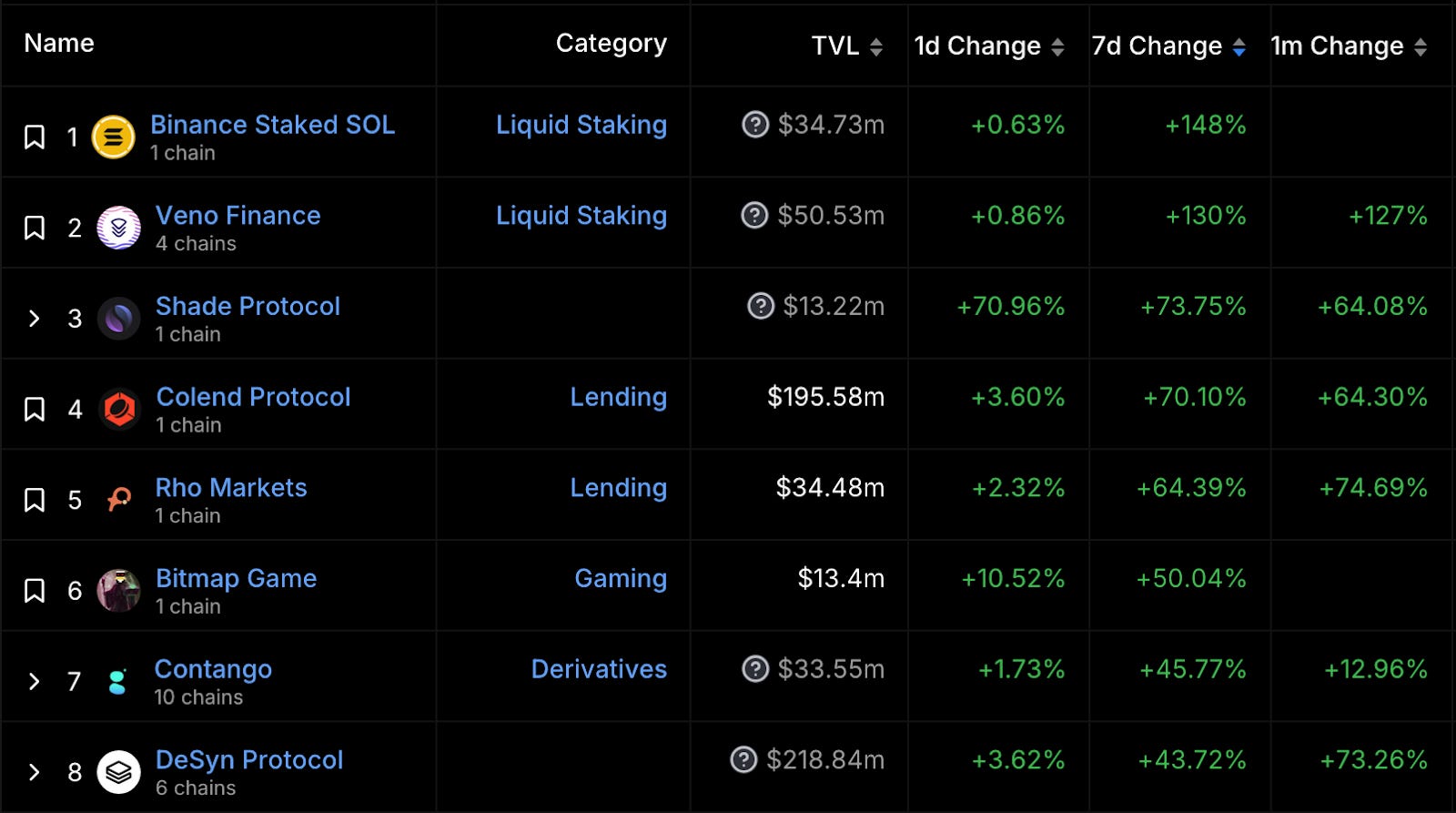 漲幅最大項目(TVL 大於 1,000 萬美金)