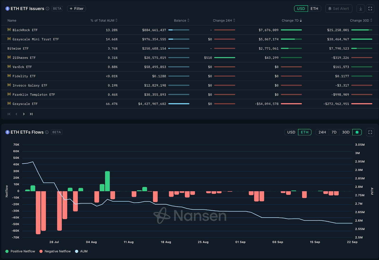 ETF 連續兩週與幣價呈現相反行情,總計淨流出約 4,000 萬美元,主要由 Grayscale 每週約流出 2% 總淨值,其餘以 Blackrock 為首穩健持續流入。