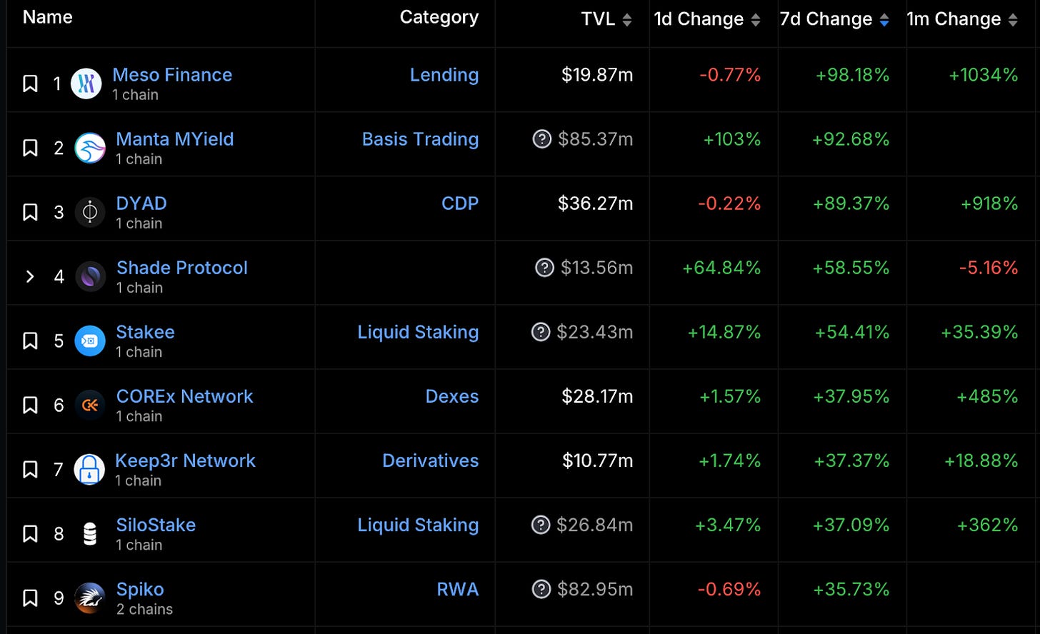 漲幅最大項目(TVL 大於 1,000 萬美金)