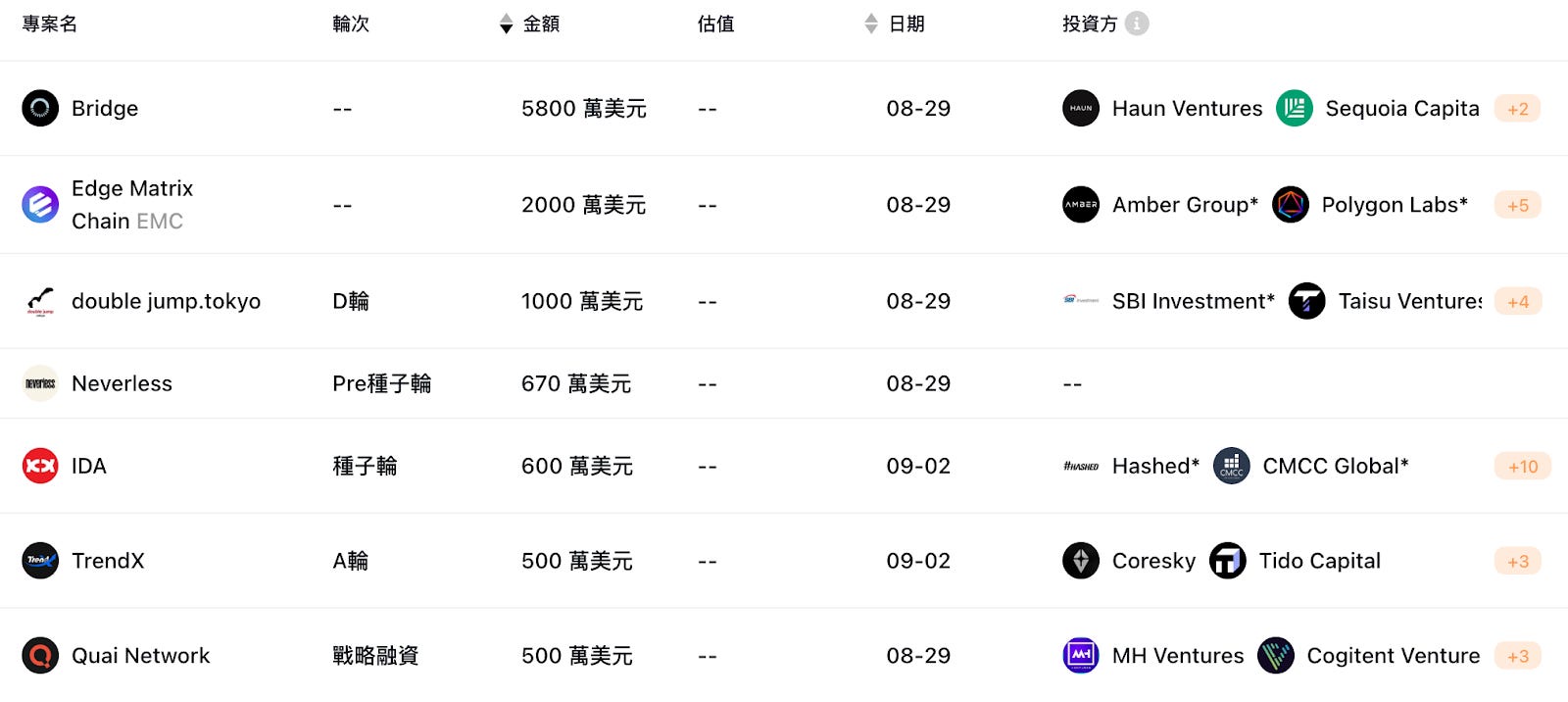 double jump.tokyo(1,000 萬美元)是日本遊戲公鏈 Oasys 開發商。此輪由 SBI 領投、Sony 集團也在參投,可視為與 Soneium 遊戲板塊的深化綁定。